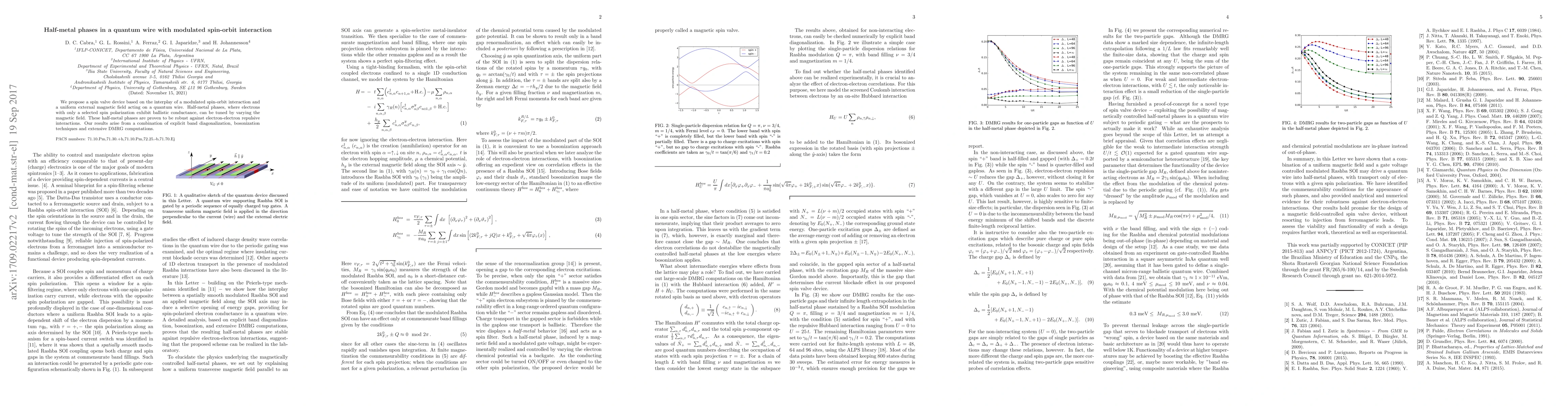 This paper proposes a spin valve device using a quantum wire with a modulated spin-orbit interaction, demonstrating half-metal phases where only selected spin electrons exhibit ballistic conductance. The robustness of these phases against electron-electron interactions is confirmed through band diagonalization, bosonization, and DMRG computations.