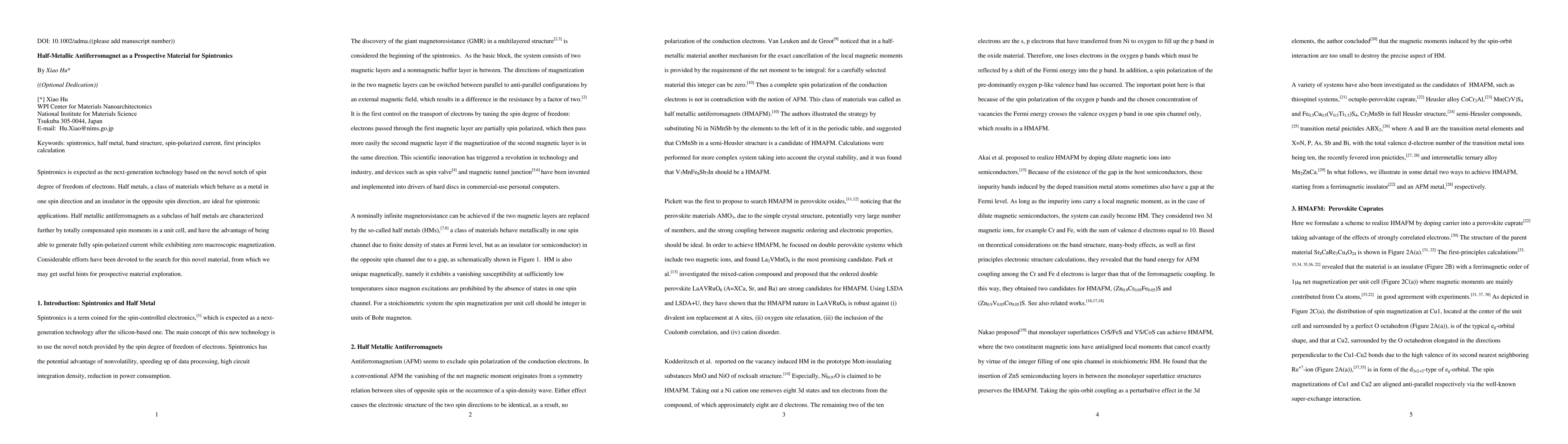 Spintronics is expected as the next-generation technology based on the novel notch of spin degree of freedom of electrons. Half metals, a class of materials which behave as a metal in one spin direction and an insulator in the opposite spin direction, are ideal for spintronic applications. Half metallic antiferromagnets as a subclass of half metals are characterized further by totally compensated spin moments in a unit cell, and have the advantage of being able to generate fully spin-polarized current while exhibiting zero macroscopic magnetization. Considerable efforts have been devoted to the search for this novel material, from which we may get useful hints for prospective material exploration.