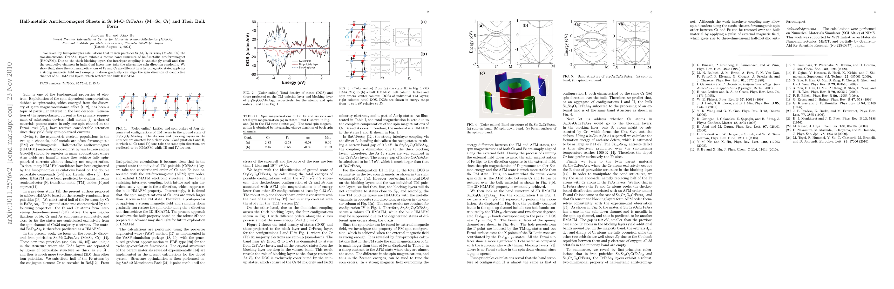 We reveal by first-principles calculations that in iron pnictides Sr4M2O6CrFeAs2 (M=Sc, Cr) the two-dimensional CrFeAs2 layers exhibit a robust band structure of half-metallic antiferromagnet (HMAFM). Due to the thick blocking layer, the interlayer coupling is vanishingly small and thus the conductive channels in individual layers may take the alternative spin direction randomly. We show that, since the spin magnetizations of Fe and Cr are different in a ferromagnetic state, applying a strong magnetic field and ramping it down gradually can align the spin direction of conductive channel of all HMAFM layers, which restores the bulk HMAFM.