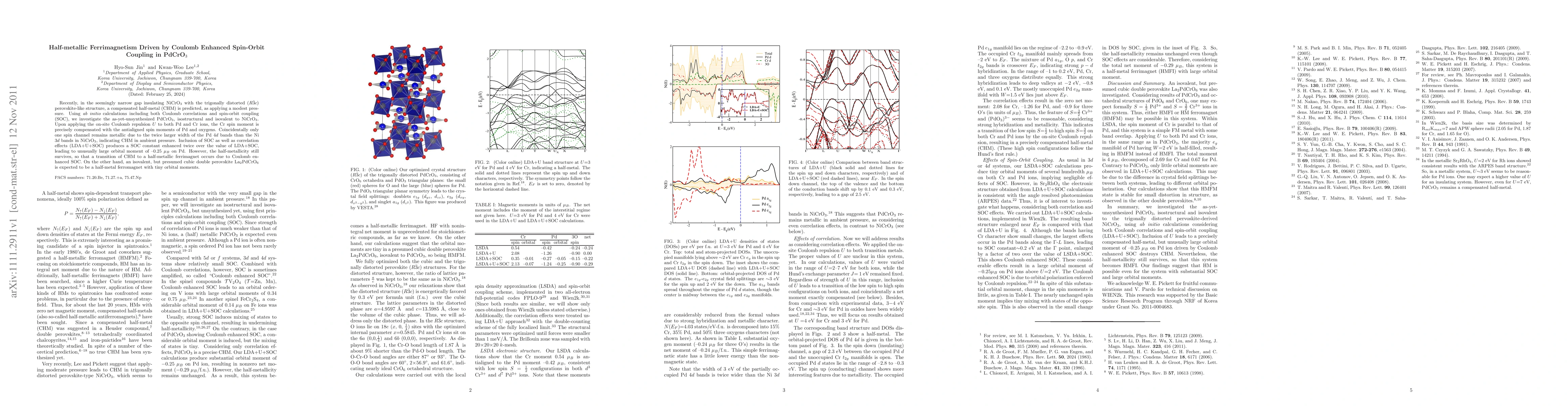 Recently, in the seemingly narrow gap insulating NiCrO$_3$ with the trigonally distorted (R-3c) perovskite-like structure, a compensated half-metal (CHM) is predicted, as applying a modest pressure. Using ab initio calculations including both Coulomb correlations and spin-orbit coupling (SOC), we investigate the as-yet-unsynthesized PdCrO$_3$, isostructural and isovalent to NiCrO$_3$. Upon applying the on-site Coulomb repulsion $U$ to both Pd and Cr ions, the Cr spin moment is precisely compensated with the antialigned spin moments of Pd and oxygens. Coincidentally only one spin channel remains metallic due to the twice larger width of the Pd 4d bands than the Ni 3d bands in NiCrO$_3$, indicating CHM in ambient pressure. Inclusion of SOC as well as correlation effects (LDA+U+SOC) produces a SOC constant enhanced twice over the value of LDA+SOC, leading to unusually large orbital moment of --0.25 $\mu_B$ on Pd. However, the half-metallicity still survives, so that a transition of CHM to a half-metallic ferrimagnet occurs due to Coulomb enhanced SOC. On the other hand, an isovalent, but presumed cubic double perovskite La$_2$PdCrO$_6$ is expected to be a half-metal ferromagnet with tiny orbital moments.
