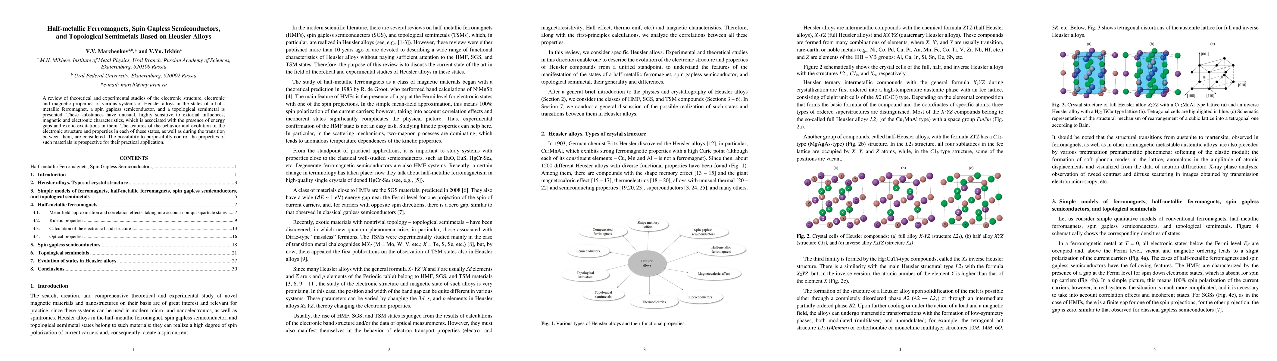 A review of theoretical and experimental studies of the electronic structure, electronic and magnetic properties of various systems of Heusler alloys in the states of a half-metallic ferromagnet, a spin gapless semiconductor, and a topological semimetal is presented. These substances have unusual, highly sensitive to external influences, magnetic and electronic characteristics, which is associated with the presence of energy gaps and exotic excitations in them. The features of the behavior and evolution of the electronic structure and properties in each of these states, as well as during the transition between them, are considered. The possibility to purposefully control the properties of such materials is prospective for their practical application.
