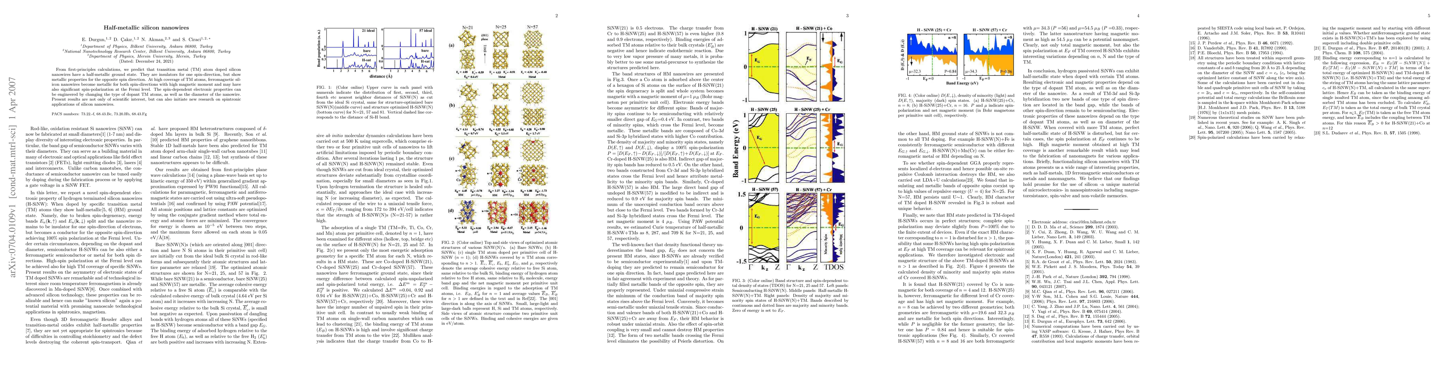 Researchers predict that transition metal-doped silicon nanowires exhibit half-metallic properties, being insulating for one spin direction and metallic for the opposite. By adjusting dopant type and nanowire diameter, these properties can be finely tuned, potentially leading to novel spintronic applications.