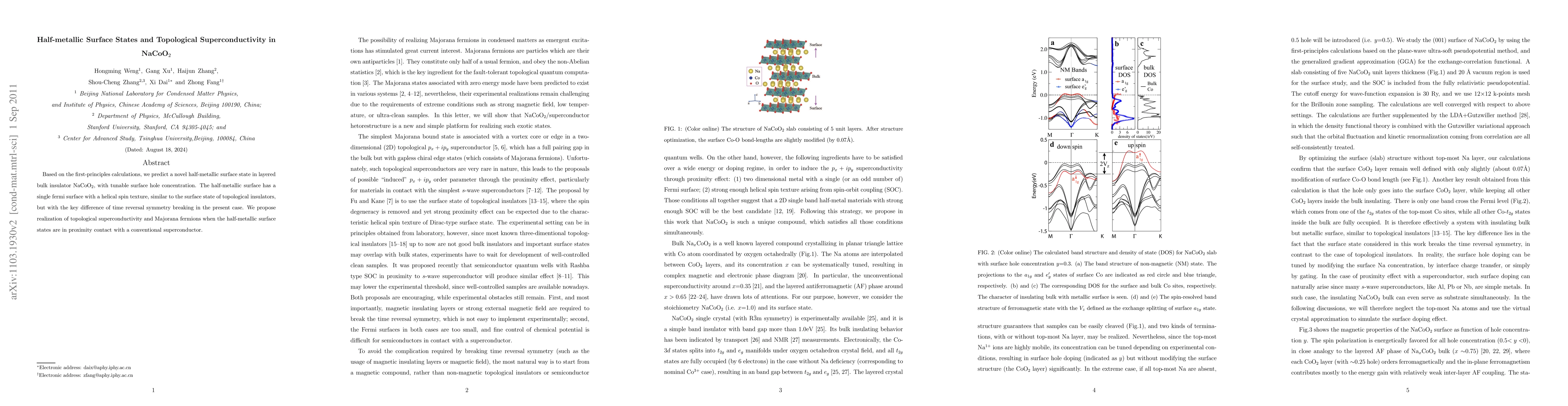 This research predicts a half-metallic surface state in NaCoO$_2$ with a helical spin texture, akin to topological insulators but with broken time-reversal symmetry. The study also proposes the potential for topological superconductivity and Majorana fermions when these states are in contact with a conventional superconductor.