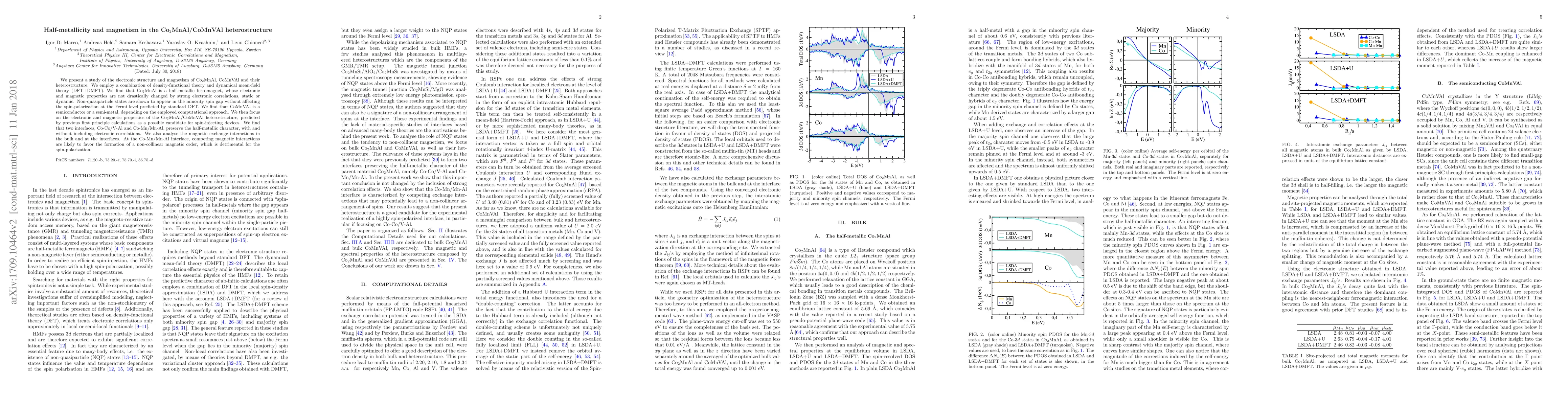 We present a study of the electronic structure and magnetism of Co$_2$MnAl, CoMnVAl and their heterostructure. We employ a combination of density-functional theory and dynamical mean-field theory (DFT+DMFT). We find that Co$_2$MnAl is a half-metallic ferromagnet, whose electronic and magnetic properties are not drastically changed by strong electronic correlations, static or dynamic. Non-quasiparticle states are shown to appear in the minority spin gap without affecting the spin-polarization at the Fermi level predicted by standard DFT. We find that CoMnVAl is a semiconductor or a semi-metal, depending on the employed computational approach. We then focus on the electronic and magnetic properties of the Co$_2$MnAl/CoMnVAl heterostructure, predicted by previous first principle calculations as a possible candidate for spin-injecting devices. We find that two interfaces, Co-Co/V-Al and Co-Mn/Mn-Al, preserve the half-metallic character, with and without including electronic correlations. We also analyse the magnetic exchange interactions in the bulk and at the interfaces. At the Co-Mn/Mn-Al interface, competing magnetic interactions are likely to favor the formation of a non-collinear magnetic order, which is detrimental for the spin-polarization.