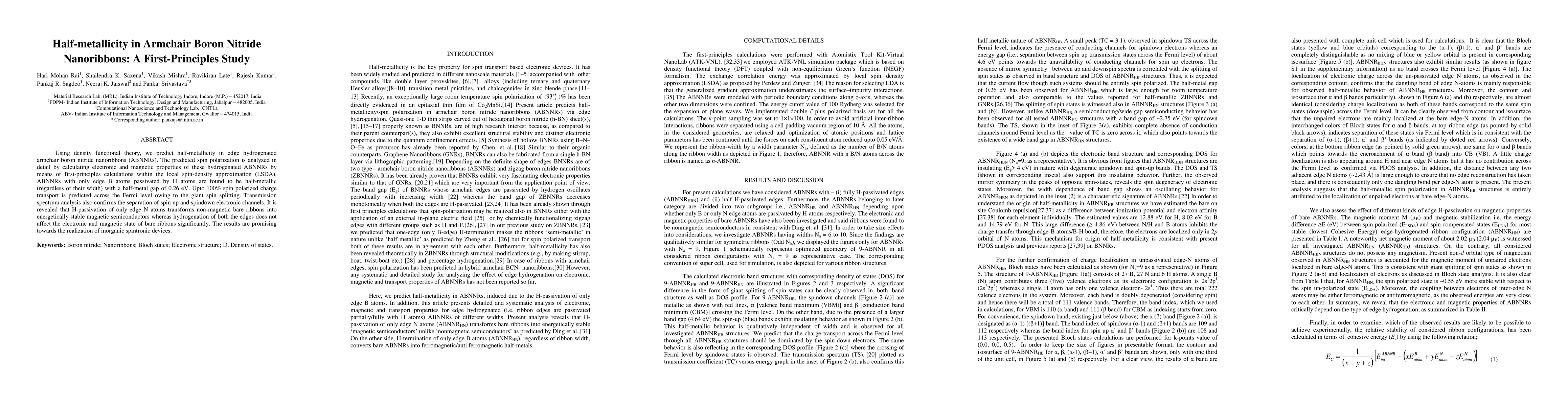 This study reveals that edge hydrogenated armchair boron nitride nanoribbons (ABNNRs) exhibit half-metallicity with 100% spin polarization and a gap of 0.26 eV, indicating potential for inorganic spintronic devices, while passivating only edge nitrogen atoms with hydrogen induces magnetism in non-magnetic ribbons.
