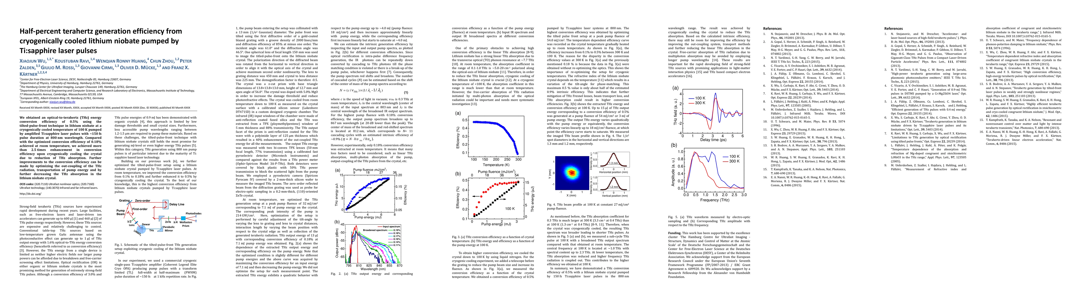 The paper presents a method to achieve high THz generation efficiency using cryogenically cooled lithium niobate and Ti:sapphire laser pulses, demonstrating a 0.5% conversion efficiency at 100 K.