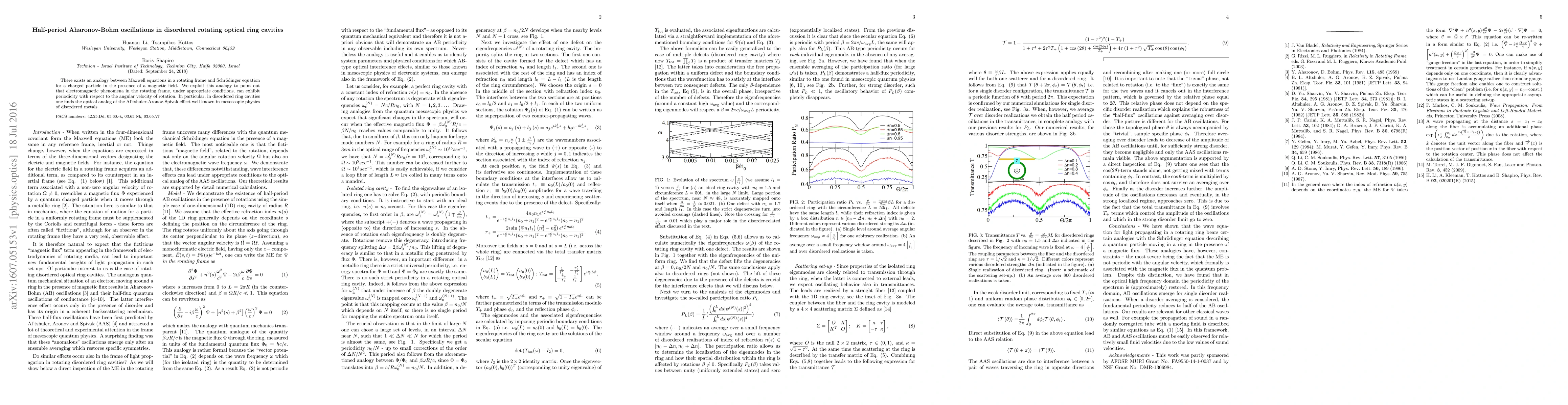 Summary: This paper explores the optical analog of the Aharonov-Bohm effect in disordered rotating optical ring cavities, demonstrating half-period oscillations analogous to the Al'tshuler-Aronov-Spivak effect in mesoscopic physics, leveraging the analogy between Maxwell's equations in a rotating frame and the Schrödinger equation for charged particles in a magnetic field.