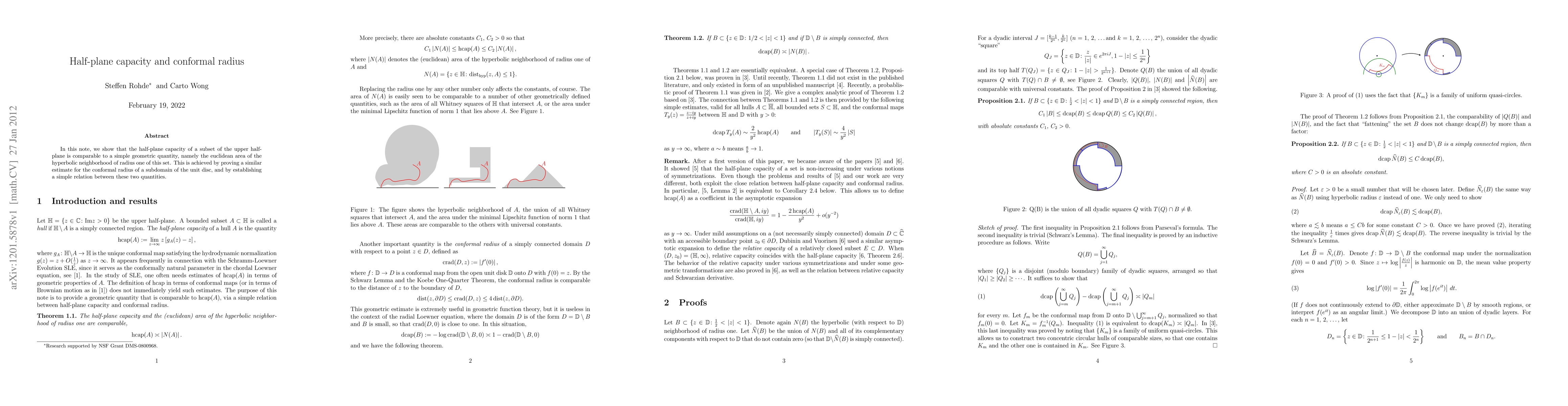 This paper demonstrates a relationship between the half-plane capacity of a subset in the upper half-plane and its Euclidean area in the hyperbolic neighborhood of radius one. It achieves this by proving a comparable estimate for the conformal radius in the unit disc and establishing a connection between the two quantities.