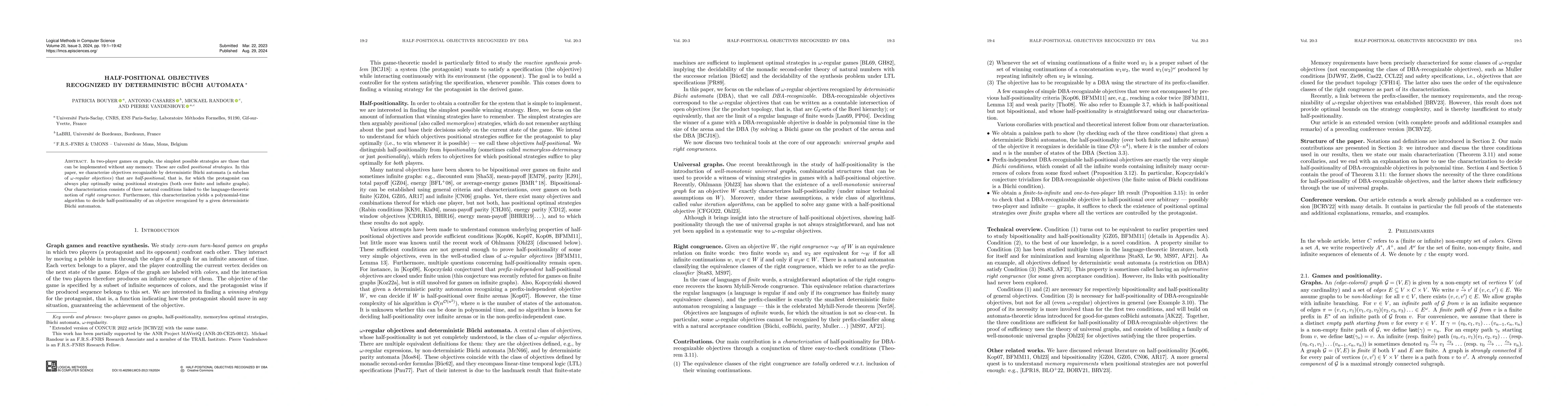 This paper characterizes half-positional objectives in two-player games on graphs using deterministic B\"uchi automata, showing that such objectives can always be optimally played with positional strategies. The characterization involves three conditions linked to right congruence, and a polynomial-time algorithm is provided to determine if an objective is half-positional.