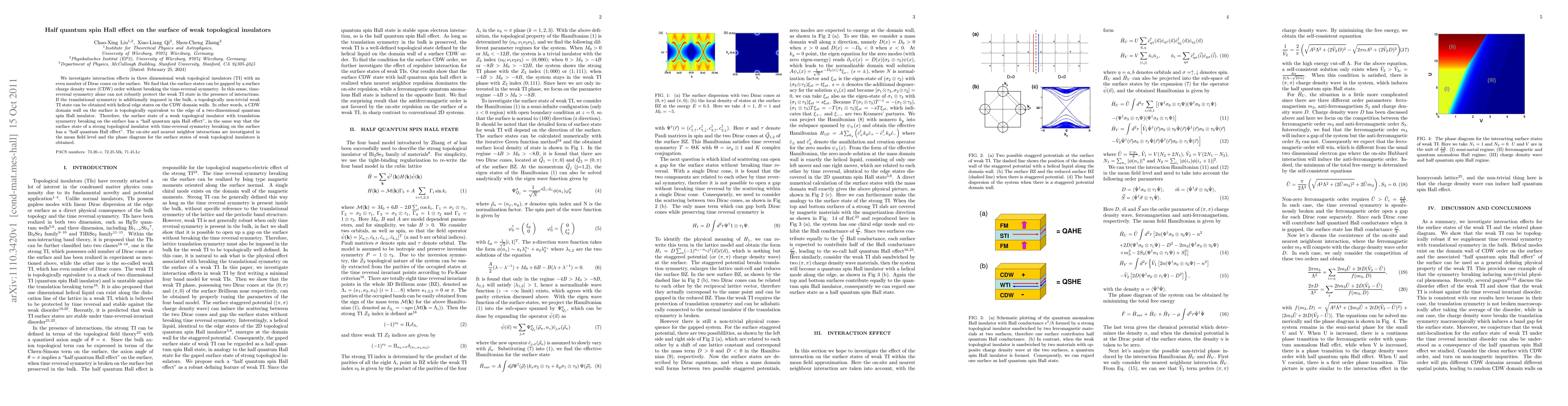 We investigate interaction effects in three dimensional weak topological insulators (TI) with an even number of Dirac cones on the surface. We find that the surface states can be gapped by a surface charge density wave (CDW) order without breaking the time-reversal symmetry. In this sense, time reversal symmetry alone can not robustly protect the weak TI state in the presence of interactions. If the translational symmetry is additionally imposed in the bulk, a topologically non-trivial weak TI state can be obtained with helical edge states on the CDW domain walls. In other words, a CDW domain wall on the surface is topologically equivalent to the edge of a two-dimensional quantum spin Hall insulator. Therefore, the surface state of a weak topological insulator with translation symmetry breaking on the surface has a "half quantum spin Hall effect", in the same way that the surface state of a strong topological insulator with time-reversal symmetry breaking on the surface has a "half quantum Hall effect". The on-site and nearest neighbor interactions are investigated in the mean field level and the phase diagram for the surface states of weak topological insulators is obtained.