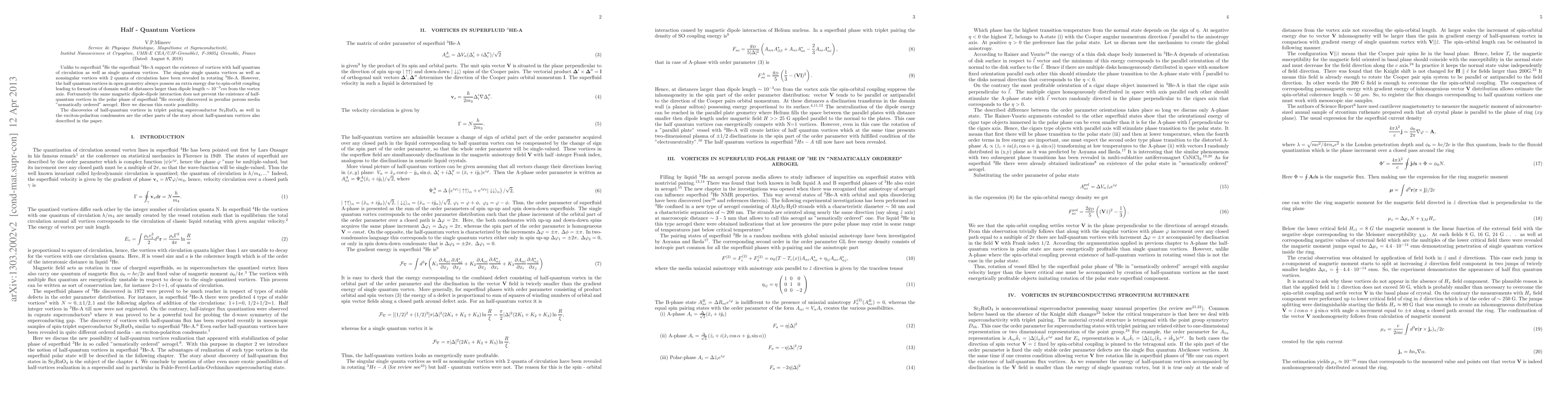 Unlike to superfluid $^4$He the superfluid $^3$He-A support the existence of vortices with half quantum of circulation as well as single quantum vortices. The singular single quanta vortices as well as nonsingular vortices with 2 quanta of circulation have been revealed in rotating $^3$He-A. However, the half quantum vortices in open geometry always possess an extra energy due to spin-orbit coupling leading to formation of domain wall at distances larger than dipole length $\sim 10^{-3}cm$ from the vortex axis. Fortunately the same magnetic dipole-dipole interaction does not prevent the existence of half-quantum vortices in the polar phase of superfluid $^3$He recently discovered in peculiar porous media "nematically ordered" aerogel. Here we discuss this exotic possibility. The discoveries of half-quantum vortices in triplet pairing superconductor Sr$_2$RuO$_4$ as well in the exciton-polariton condensates are the other parts of the story about half-quantum vortices also described in the paper.