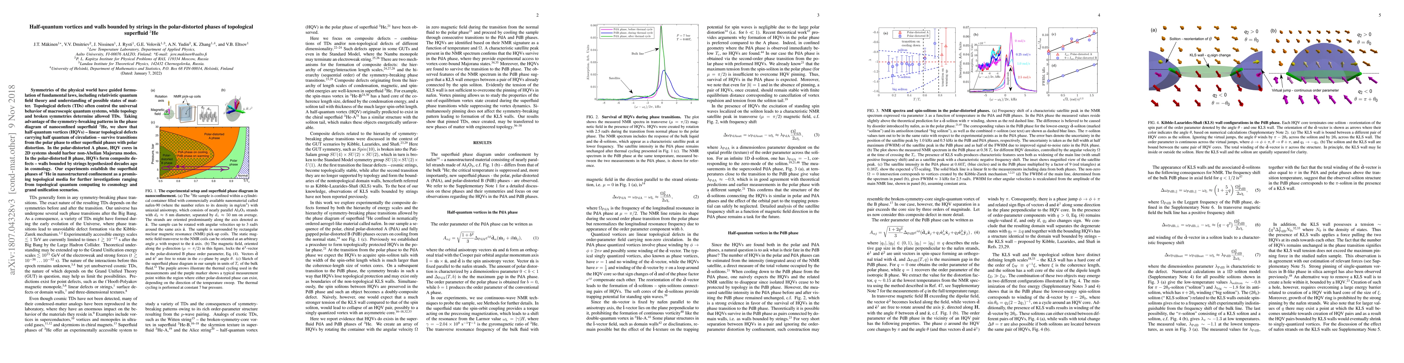 Symmetries of the physical world have guided formulation of fundamental laws, including relativistic quantum field theory and understanding of possible states of matter. Topological defects (TDs) often control the universal behavior of macroscopic quantum systems, while topology and broken symmetries determine allowed TDs. Taking advantage of the symmetry-breaking patterns in the phase diagram of nanoconfined superfluid $^3$He, we show that half-quantum vortices (HQVs) -- linear topological defects carrying half quantum of circulation -- survive transitions from the polar phase to other superfluid phases with polar distortion. In the polar-distorted A phase, HQV cores in 2D systems should harbor non-Abelian Majorana modes. In the polar-distorted B phase, HQVs form composite defects -- walls bounded by strings hypothesized decades ago in cosmology. Our experiments establish the superfluid phases of $^3$He in nanostructured confinement as a promising topological media for further investigations ranging from topological quantum computing to cosmology and grand unification scenarios.