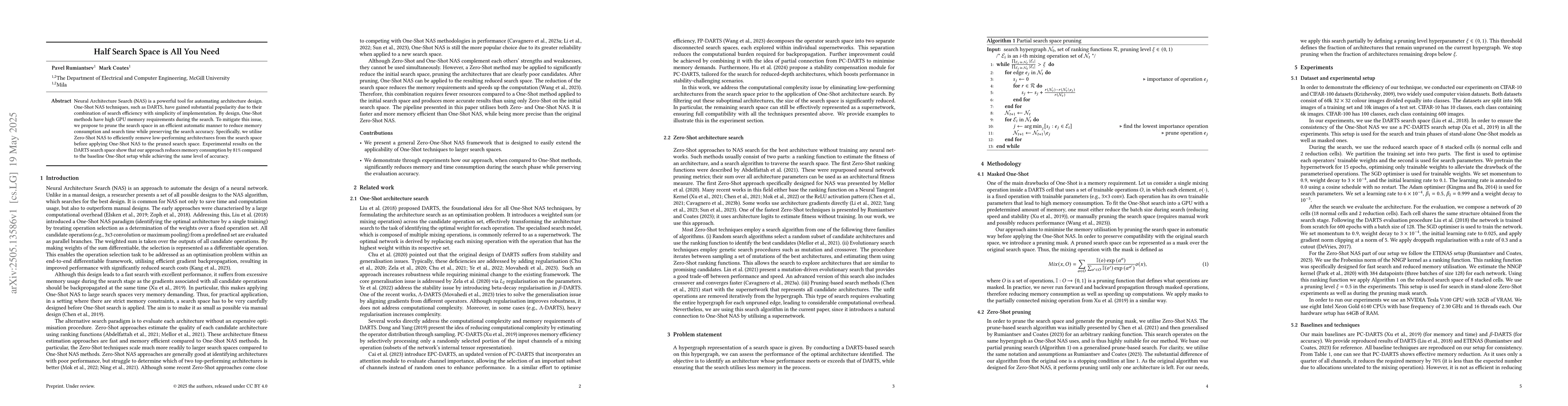 An automated, memory-efficient approach to prune the search space in One-Shot NAS by combining Zero-Shot NAS for initial pruning and subsequent One-Shot NAS on the reduced search space.
