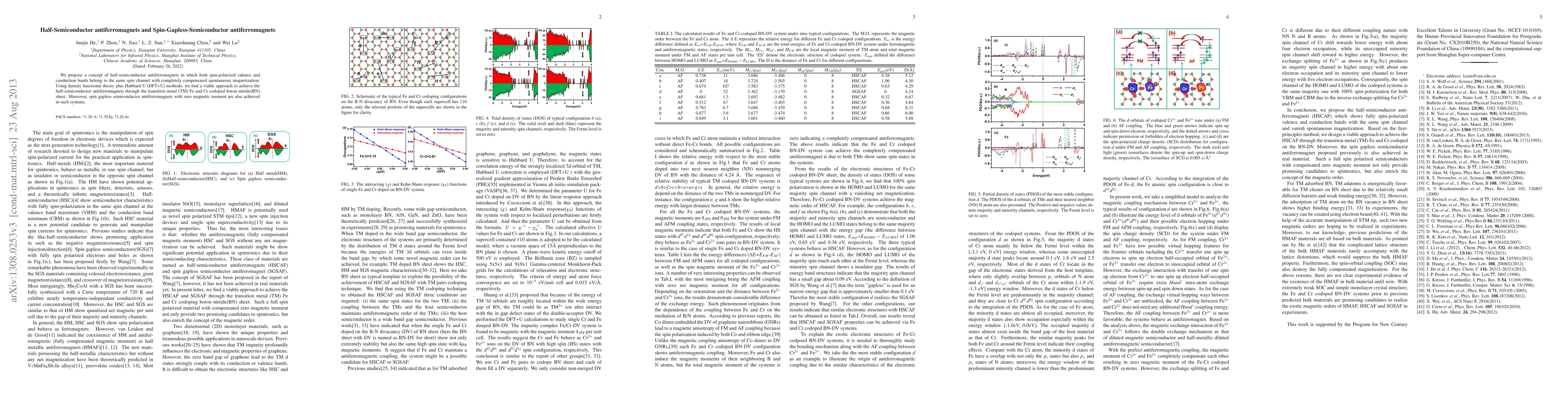 The paper introduces 'half-semiconductor antiferromagnets' with fully compensated spontaneous magnetization, where both spin-polarized valence and conduction bands belong to the same spin channel. This is proposed to be achievable via Fe and Cr codoping in boron nitride sheets using DFT+U methods, also realizing 'spin gapless semiconductor antiferromagnets' with zero magnetic moment.