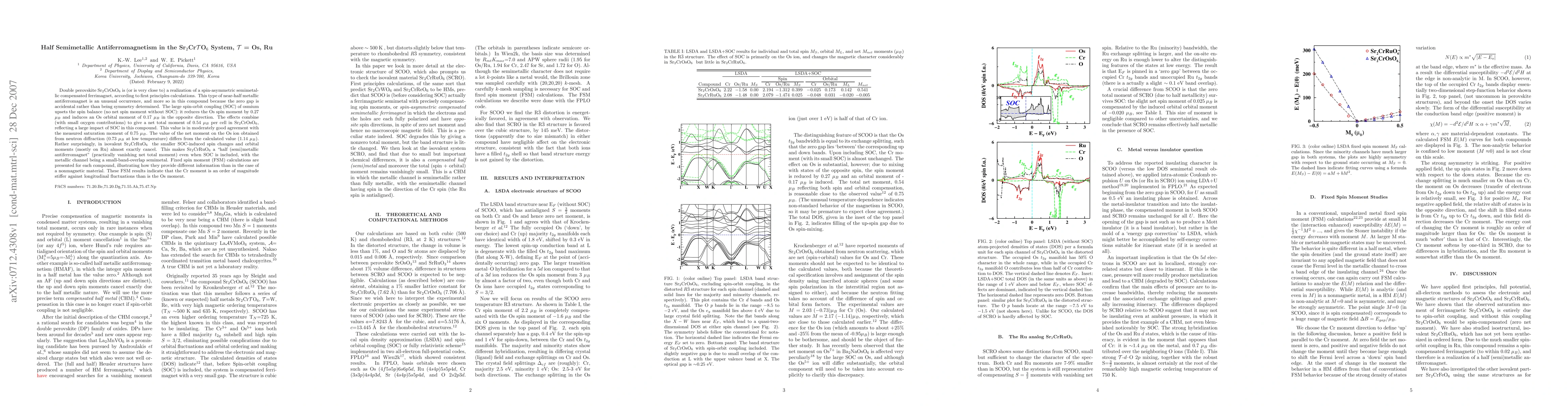 Double perovskite Sr$_2$CrOsO$_6$ is (or is very close to) a realization of a spin-asymmetric semimetallic compensated ferrimagnet, according to first principles calculations. This type of near-half metallic antiferromagnet is an unusual occurrence, and more so in this compound because the zero gap is accidental rather than being symmetry determined. The large spin-orbit coupling (SOC) of osmium upsets the spin balance (no net spin moment without SOC): it reduces the Os spin moment by 0.27 $\mu_B$ and induces an Os orbital moment of 0.17 $\mu_B$ in the opposite direction. The effects combine (with small oxygen contributions) to give a net total moment of 0.54 $\mu_B$ per cell in \scoo, reflecting a large impact of SOC in this compound. This value is in moderately good agreement with the measured saturation moment of 0.75 $\mu_B$. The value of the net moment on the Os ion obtained from neutron diffraction (0.73 $\mu_B$ at low temperature) differs from the calculated value (1.14 $\mu_B$). Rather surprisingly, in isovalent Sr$_2$CrRuO$_6$ the smaller SOC-induced spin changes and orbital moments (mostly on Ru) almost exactly cancel. This makes Sr$_2$CrRuO$_6$ a "half (semi)metallic antiferromagnet" (practically vanishing net total moment) even when SOC is included, with the metallic channel being a small-band-overlap semimetal. Fixed spin moment (FSM) calculations are presented for each compound, illustrating how they provide different information than in the case of a nonmagnetic material. These FSM results indicate that the Cr moment is an order of magnitude stiffer against longitudinal fluctuations than is the Os moment.