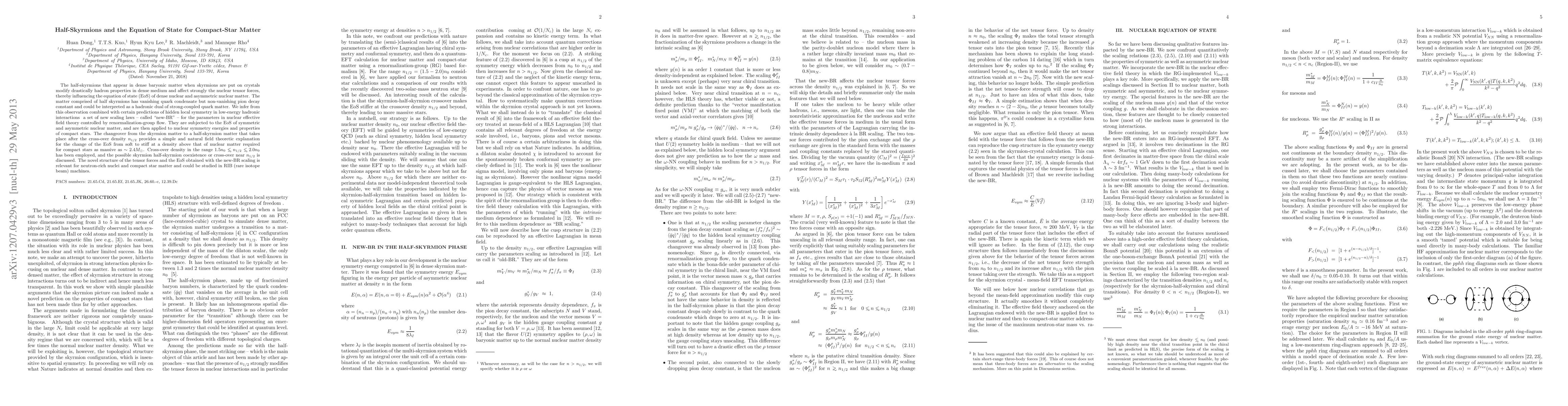 The half-skyrmions that appear in dense baryonic matter when skyrmions are put on crystals modify drastically hadron properties in dense medium and affect strongly the nuclear tensor forces, thereby influencing the equation of state (EoS) of dense nuclear and asymmetric nuclear matter. The matter comprised of half skyrmions has vanishing quark condensate but non-vanishing pion decay constant and could be interpreted as a hadronic dual of strong-coupled quark matter. We infer from this observation combined with certain predictions of hidden local symmetry in low-energy hadronic interactionsa a set of new scaling laws -- called "new-BR" -- for the parameters in nuclear effective field theory controlled by renormalization-group flow. They are subjected to the EoS of symmetric and asymmetric nuclear matter, and are then applied to nuclear symmetry energies and properties of compact stars. The changeover from the skyrmion matter to a half-skyrmion matter that takes place after the cross-over density $n_{1/2}$ provides a simple and natural field theoretic explanation for the change of the EoS from soft to stiff at a density above that of nuclear matter required for compact stars as massive as $\sim 2.4M_\odot$. Cross-over density in the range $1.5n_0 \lsim n_{1/2} \lsim 2.0 n_0$ has been employed, and the possible skyrmion half-skyrmion coexistence {or cross-over} near $n_{1/2}$ is discussed. The novel structure of {the tensor forces and} the EoS obtained with the new-BR scaling is relevant for neutron-rich nuclei and compact star matter and could be studied in RIB (rare isotope beam) machines.