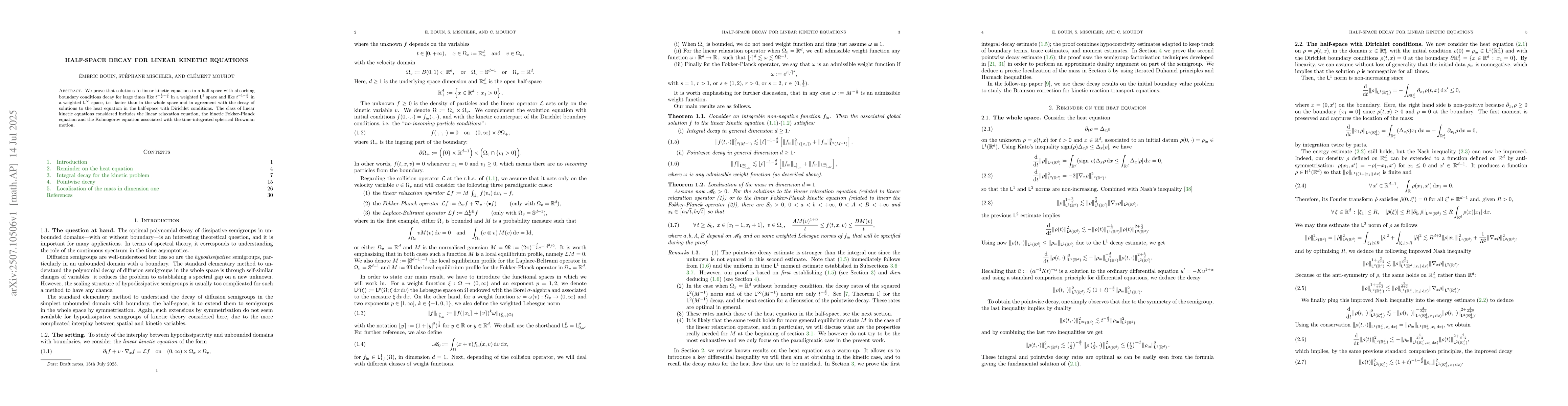 We prove that solutions to linear kinetic equations in a half-space with absorbing boundary conditions decay for large times like $t^{-\frac{1}{2}-\frac{d}{4}}$ in a weighted $\sfL^{2}$ space and like $t^{-1-\frac{d}{2}}$ in a weighted $\sfL^{\infty}$ space, i.e. faster than in the whole space and in agreement with the decay of solutions to the heat equation in the half-space with Dirichlet conditions. The class of linear kinetic equations considered includes the linear relaxation equation, the kinetic Fokker-Planck equation and the Kolmogorov equation associated with the time-integrated spherical Brownian motion.
