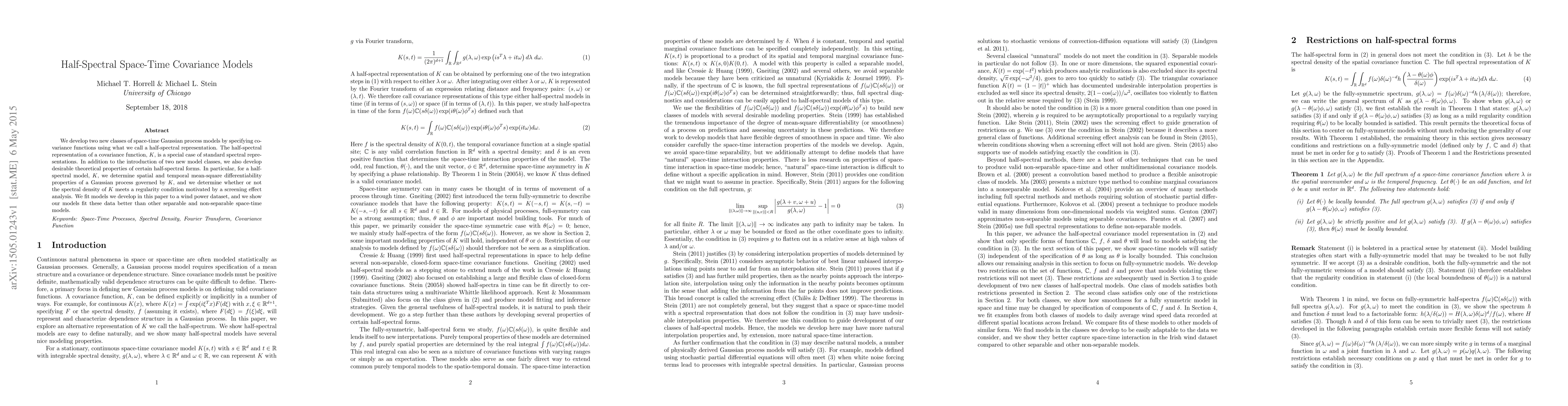This paper introduces two new classes of space-time Gaussian process models using a half-spectral representation for covariance functions. It also examines the mean-square differentiability and spectral density regularity of these models, demonstrating superior performance on a wind power dataset compared to other models.