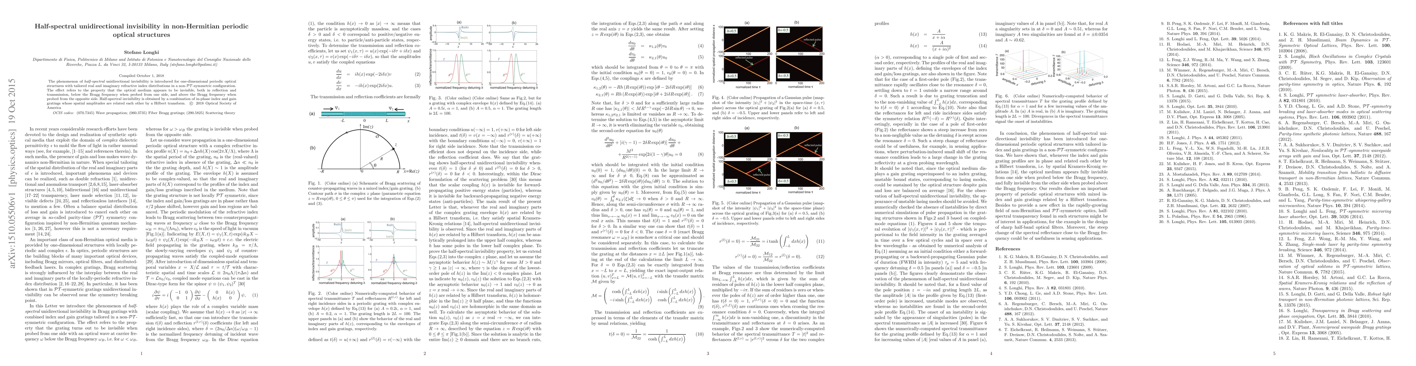 This paper introduces the concept of half-spectral unidirectional invisibility in non-Hermitian periodic optical structures, where the medium appears invisible below the Bragg frequency when probed from one side and above it from the opposite. This effect is achieved through tailored real and imaginary refractive index distributions combined with in-phase index and gain gratings related by a Hilbert transform.