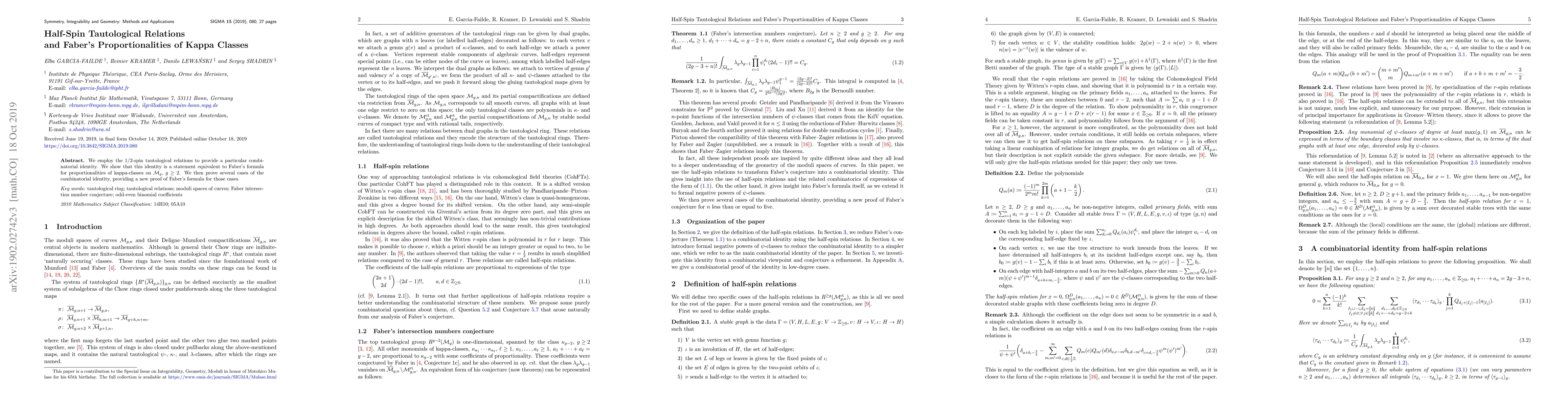 This paper uses $1/2$-spin tautological relations to establish a combinatorial identity, demonstrating its equivalence to Faber's formula for kappa-class proportionalities on $\mathcal{M}_g$ for $g \geq 2$, and offers a new proof for several cases of this identity.