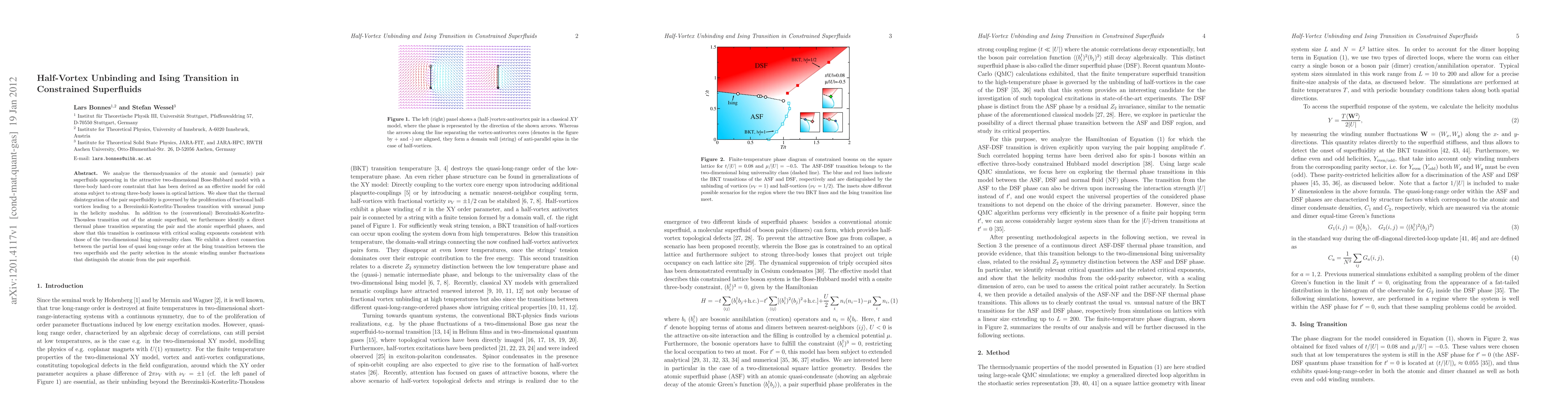 We analyze the thermodynamics of the atomic and (nematic) pair superfluids appearing in the attractive two-dimensional Bose-Hubbard model with a three-body hard-core constraint that has been derived as an effective model for cold atoms subject to strong three-body losses in optical lattices. We show that the thermal disintegration of the pair superfluidity is governed by the proliferation of fractional half-vortices leading to a Berezinskii-Kosterlitz-Thousless transition with unusual jump in the helicity modulus. In addition to the (conventional) Berezinskii-Kosterlitz-Thousless transition out of the atomic superfluid, we furthermore identify a direct thermal phase transition separating the pair and the atomic superfluid phases, and show that this transition is continuous with critical scaling exponents consistent with those of the two-dimensional Ising universality class. We exhibit a direct connection between the partial loss of quasi long-range order at the Ising transition between the two superfluids and the parity selection in the atomic winding number fluctuations that distinguish the atomic from the pair superfluid.