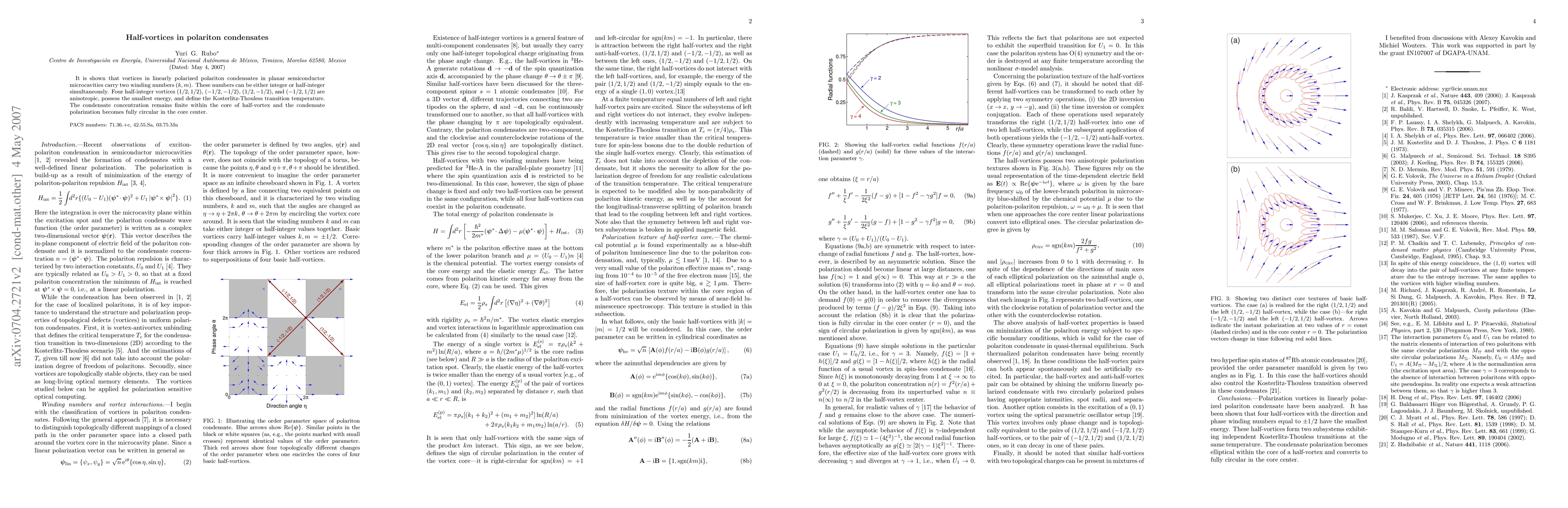 The paper introduces the concept of half-vortices in polariton condensates with two winding numbers (k,m) and demonstrates their unique energy properties and role in defining the Kosterlitz-Thouless transition temperature.