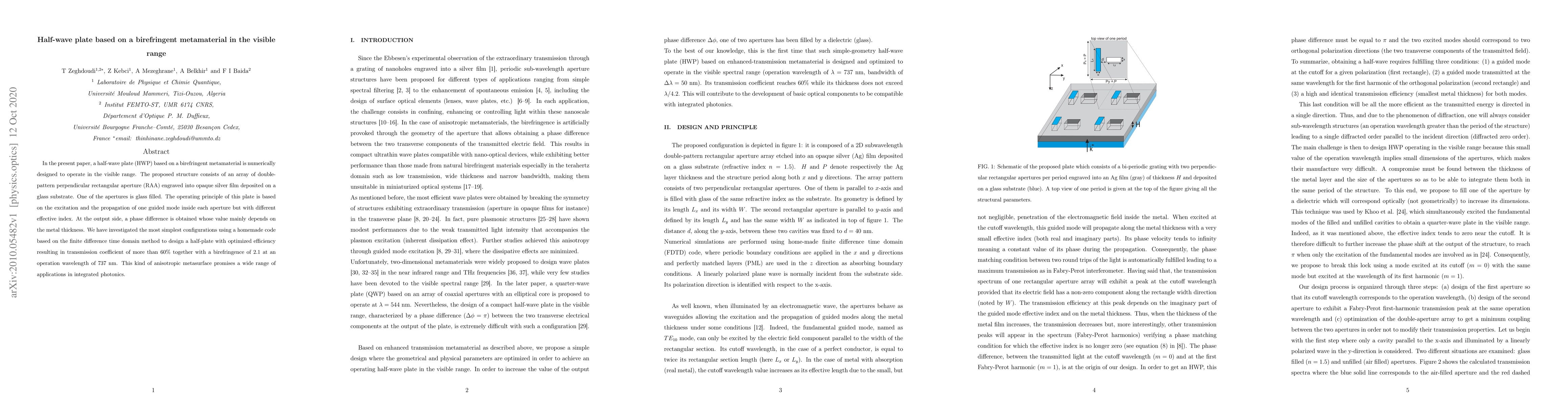 In the present paper, a half-wave plate (HWP) based on a birefringent metamaterial is numerically designed to operate in the visible range. The proposed structure consists of an array of double-pattern perpendicular rectangular aperture (RAA) engraved into opaque silver film deposited on a glass substrate. One of the apertures is glass filled. The operating principle of this plate is based on the excitation and the propagation of one guided mode inside each aperture but with different effective index. At the output side, a phase difference is obtained whose value mainly depends on the metal thickness. We have investigated the most simplest configurations using a homemade code based on the finite difference time domain method to design a half-plate with optimized efficiency resulting in transmission coefficient of more than $60\%$ together with a birefringence of $2.1$ at an operation wavelength of 737 nm. This kind of anisotropic metasurface promises a wide range of applications in integrated photonics.