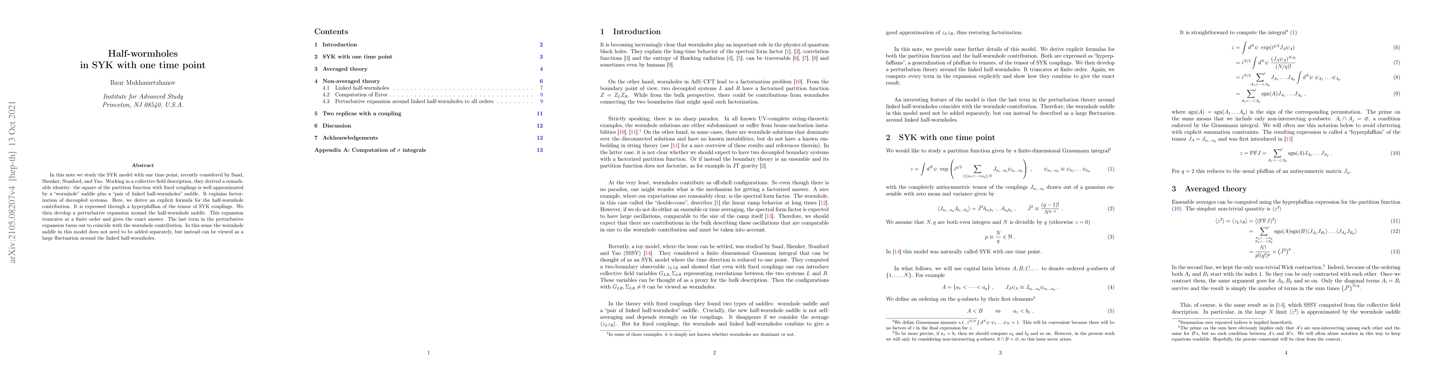 In this note we study the SYK model with one time point, recently considered by Saad, Shenker, Stanford, and Yao. Working in a collective field description, they derived a remarkable identity: the square of the partition function with fixed couplings is well approximated by a "wormhole" saddle plus a "pair of linked half-wormholes" saddle. It explains factorization of decoupled systems. Here, we derive an explicit formula for the half-wormhole contribution. It is expressed through a hyperpfaffian of the tensor of SYK couplings. We then develop a perturbative expansion around the half-wormhole saddle. This expansion truncates at a finite order and gives the exact answer. The last term in the perturbative expansion turns out to coincide with the wormhole contribution. In this sense the wormhole saddle in this model does not need to be added separately, but instead can be viewed as a large fluctuation around the linked half-wormholes.