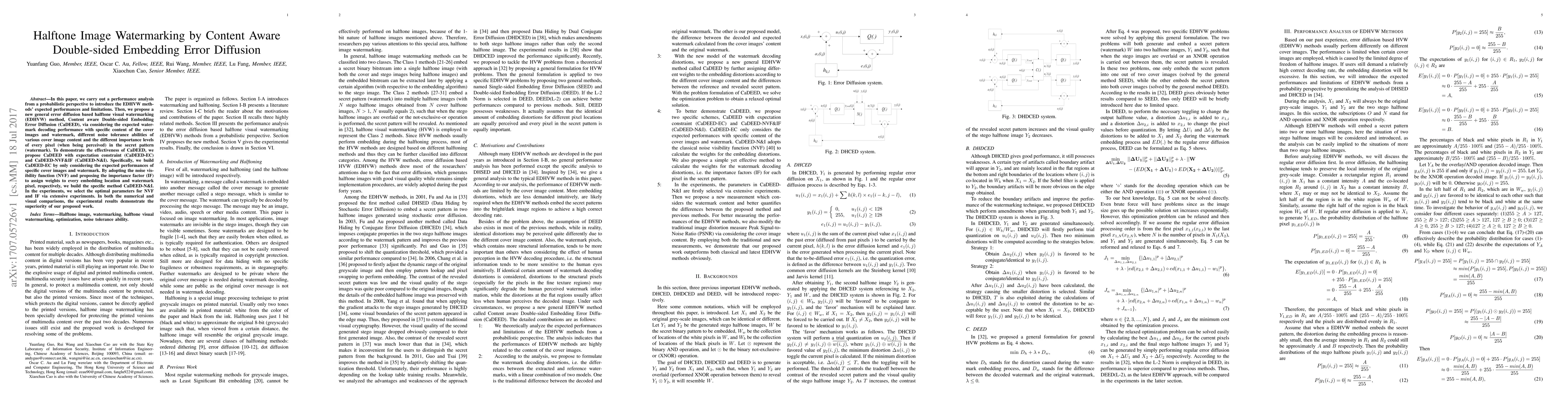This paper introduces a new error diffusion-based halftone visual watermarking method called Content aware Double-sided Embedding Error Diffusion (CaDEED), which considers the expected performance of watermark decoding, noise tolerance, and pixel importance. The proposed CaDEED-EC and CaDEED-N&I variants demonstrate superior performance in numerical and visual comparisons.