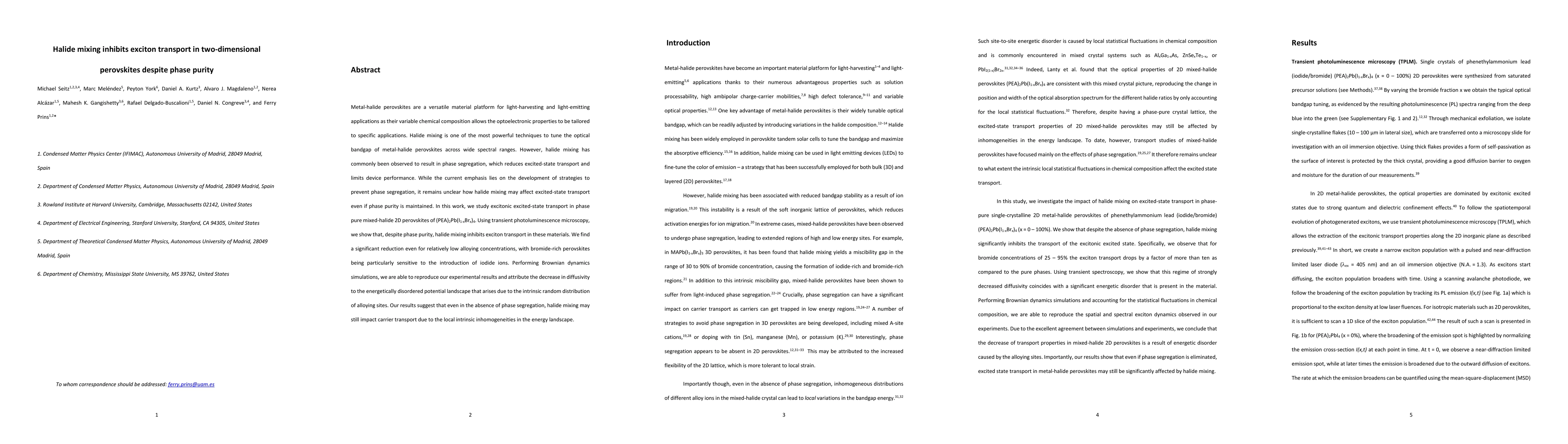 This study reveals that halide mixing in phase pure two-dimensional perovskites inhibits exciton transport despite the absence of phase segregation. The research demonstrates a significant reduction in exciton diffusivity, particularly in bromide-rich perovskites when iodide ions are introduced, due to the energetically disordered potential landscape caused by the intrinsic random distribution of alloying sites.