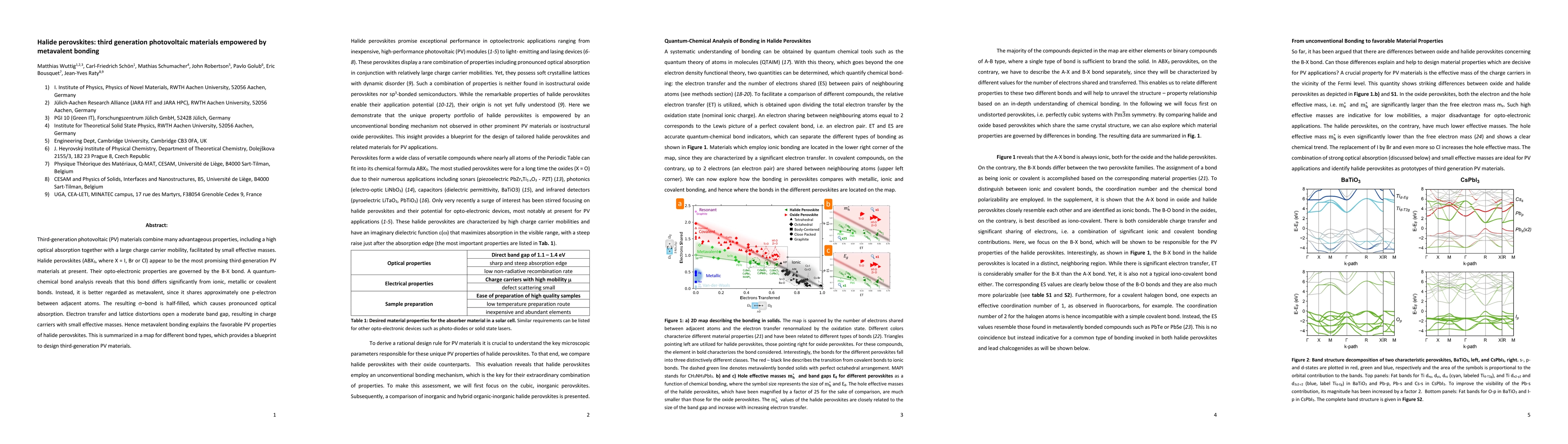 Halide perovskites (ABX3) are identified as the most promising third-generation photovoltaic materials due to their high optical absorption and large charge carrier mobility. Their unique metavalent B-X bonding, characterized by shared p-electrons, explains their exceptional opto-electronic properties and provides a blueprint for designing advanced PV materials.