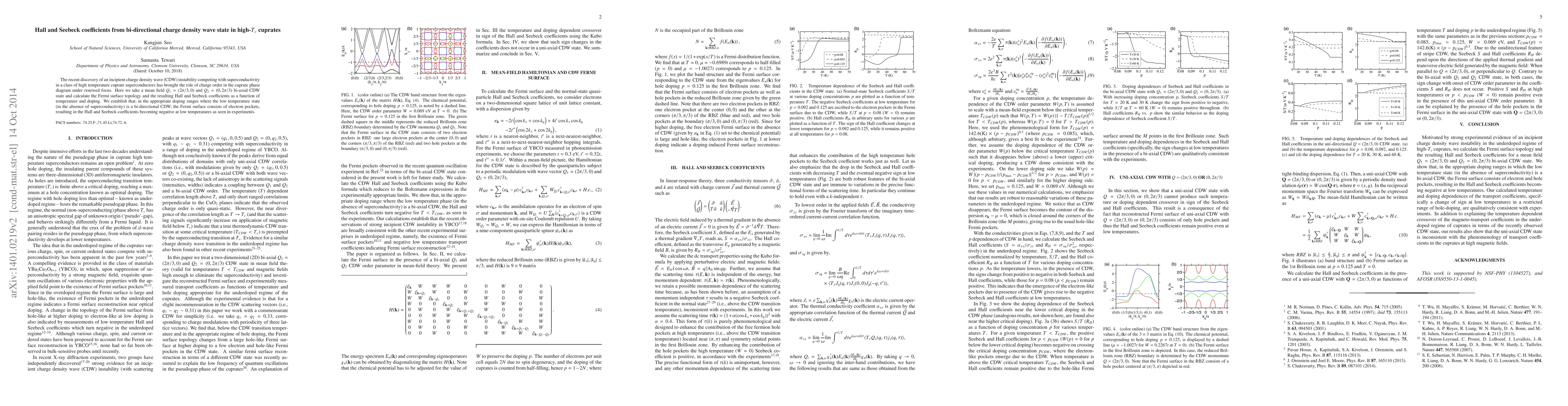 This paper investigates the Hall and Seebeck coefficients in high-$T_c$ cuprates with a bi-directional charge density wave (CDW) state, revealing that the Fermi surface topology and these coefficients become negative at low temperatures, consistent with experimental observations. The study uses a mean field bi-axial CDW state to model the effects of temperature and hole doping.