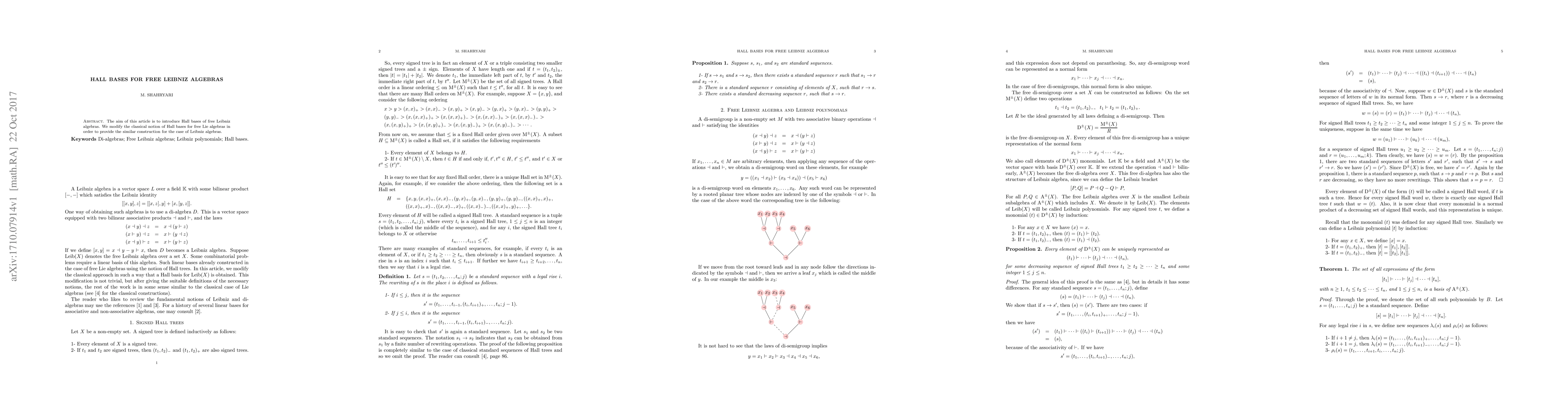 The aim of this article is to introduce Hall bases of free Leibniz algebras. We modify the classical notion of Hall bases for free Lie algebras in order to provide the similar construction for the case of Leibniz algebras.