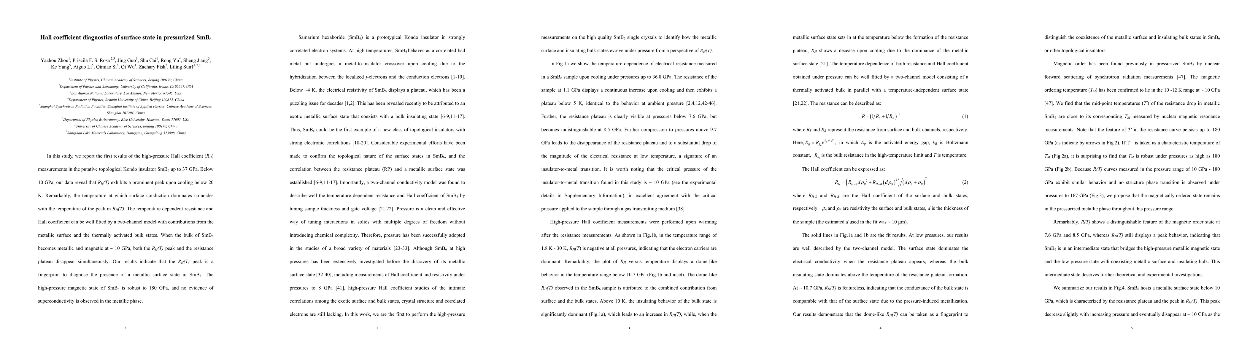 The study conducted high-pressure Hall coefficient (RH) measurements on the topological Kondo insulator SmB6 up to 37 GPa, analyzing its transport properties and fitting them to a two-channel model.
