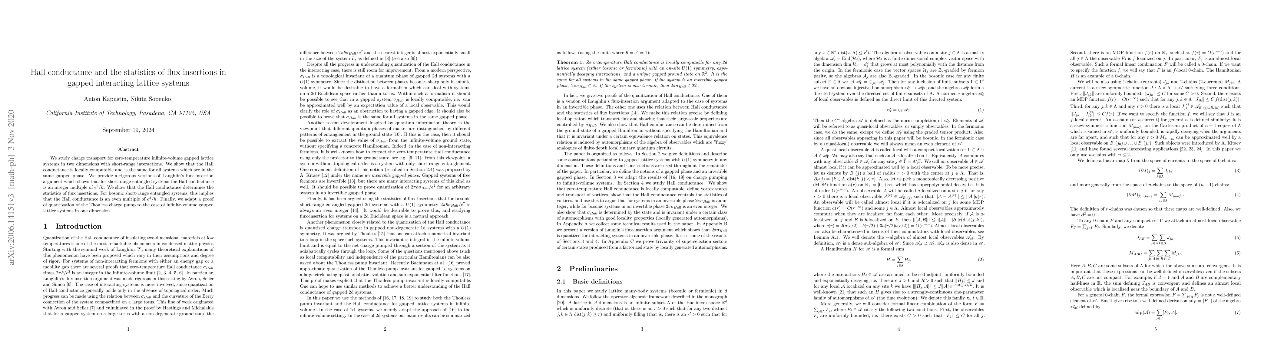This paper studies charge transport in gapped lattice systems and finds that the Hall conductance is a key determinant of quantum statistics for flux insertions, with implications for quantization of the Thouless charge pump.