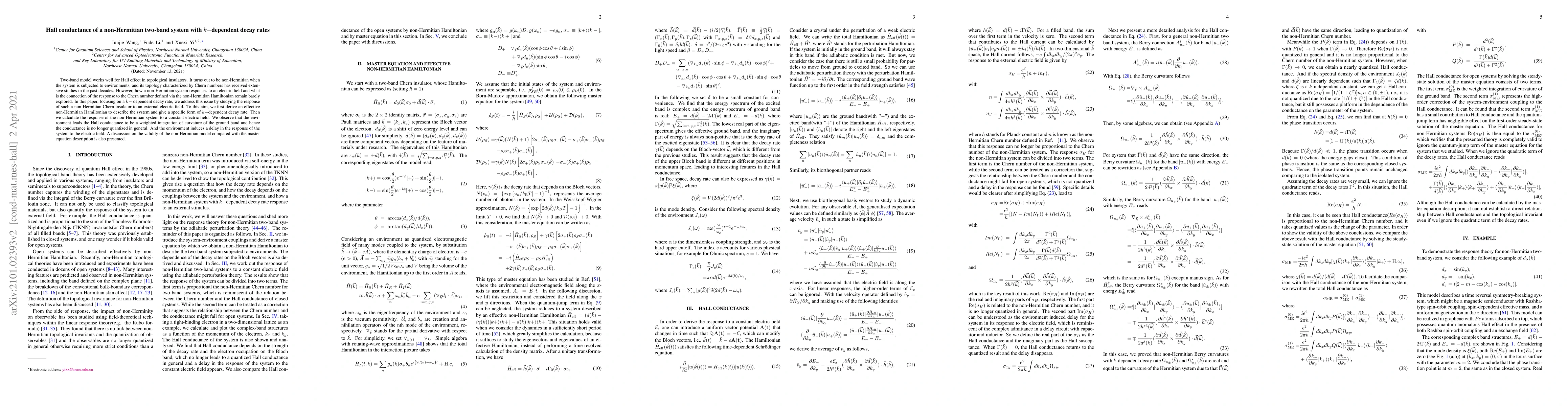 This paper investigates the Hall conductance of a non-Hermitian two-band system with k-dependent decay rates, deriving an effective Hamiltonian and finding that the environment causes the Hall conductance to be a weighted integration of the ground band's curvature, leading to non-quantized conductance. It also discusses the delay in the system's response to an electric field.