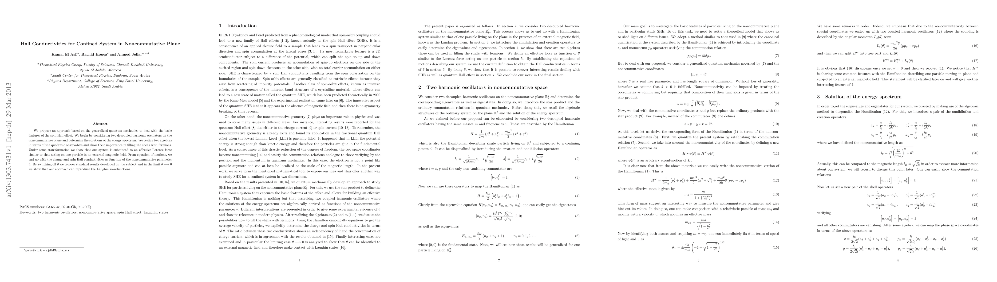 We propose an approach based on the generalized quantum mechanics to deal with the basic features of the spin Hall effect. We begin by considering two decoupled harmonic oscillators on the noncommutative plane and determine the solutions of the energy spectrum. We realize two algebras in terms of the quadratic observables and show their importance in filling the shells with fermions. Under some transformation we show that our system is submitted to an effective Lorentz force similar to that acting on one particle in an external magnetic field. From equation of motions, we end up with the charge and spin Hall conductivities as function of the noncommutative parameter \theta. By switching off \theta we recover standard results developed on the subject and in the limit \theta --> 0 we show that our approach can reproduce the Laughin wavefunctions.