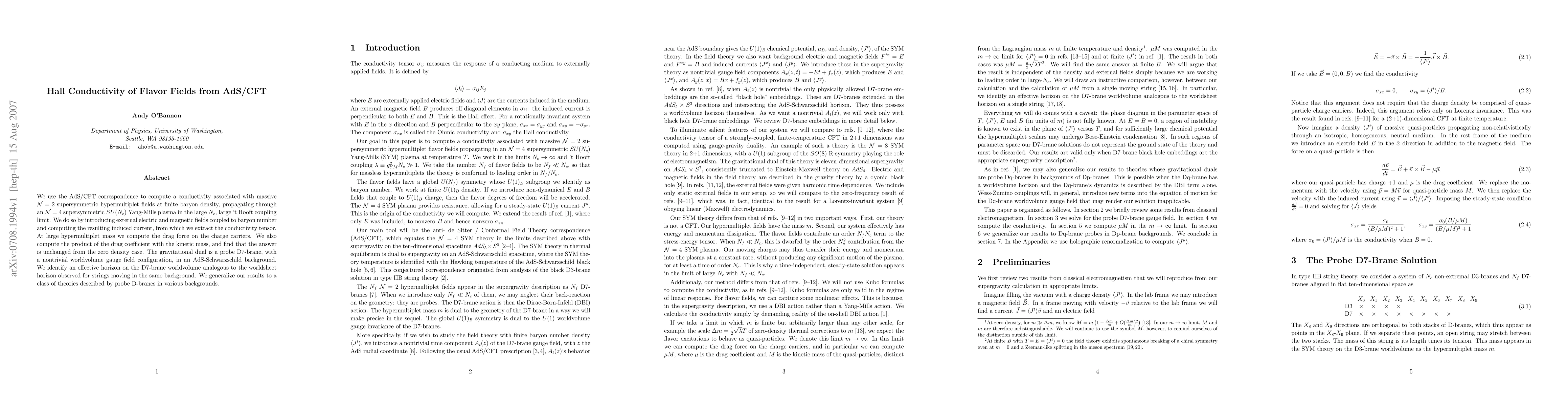 This paper uses the AdS/CFT correspondence to calculate the Hall conductivity of massive N=2 supersymmetric hypermultiplet fields in an N=4 supersymmetric Yang-Mills plasma, finding that the drag coefficient times kinetic mass remains constant at finite baryon density. The study employs a probe D7-brane in an AdS-Schwarzschild background to model the gravitational dual.