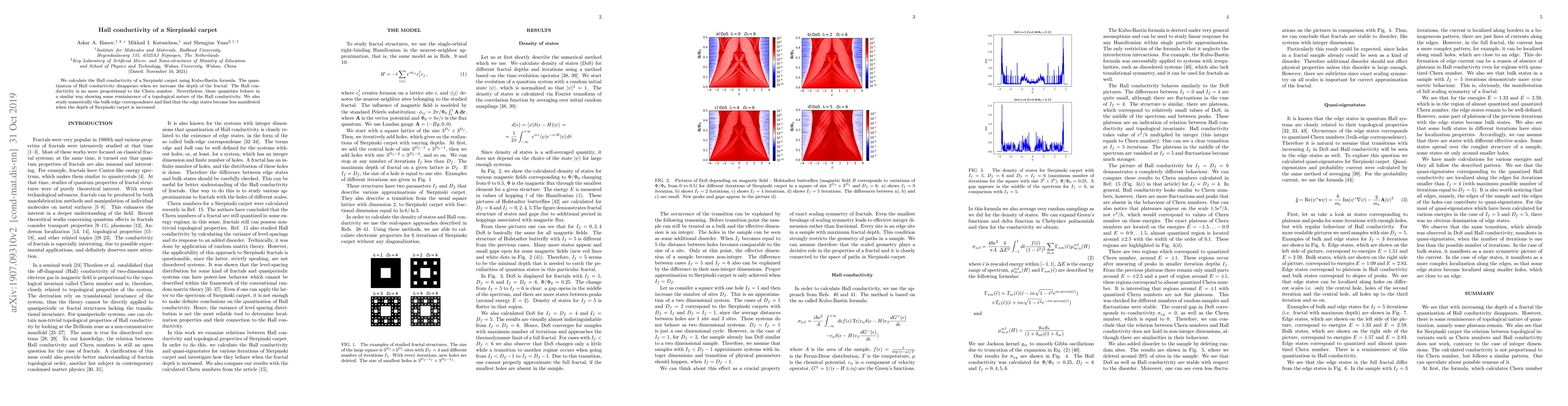 The Hall conductivity of a Sierpinski carpet, calculated using the Kubo-Bastin formula, shows quantization loss with increased fractal depth, though it retains some topological resemblance. The bulk-edge correspondence reveals diminishing edge states with greater fractal depth.