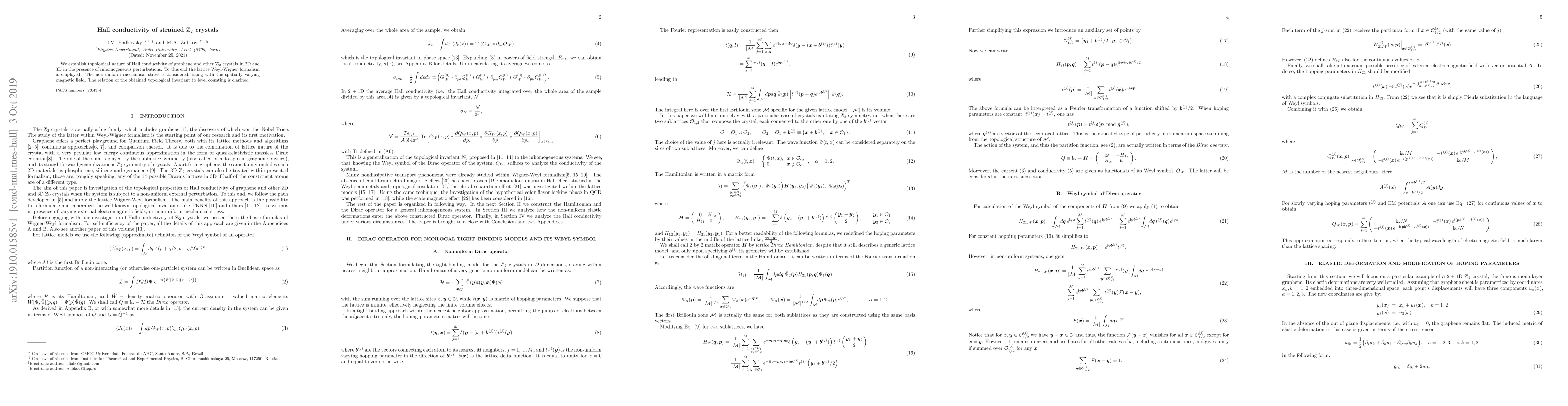 We establish topological nature of Hall conductivity of graphene and other $Z_2$ crystals in 2D and 3D in the presence of inhomogeneous perturbations. To this end the lattice Weyl-Wigner formalism is employed. The non-uniform mechanical stress is considered, along with spatially varying magnetic field. The relation of the obtained topological invariant to level counting is clarified.