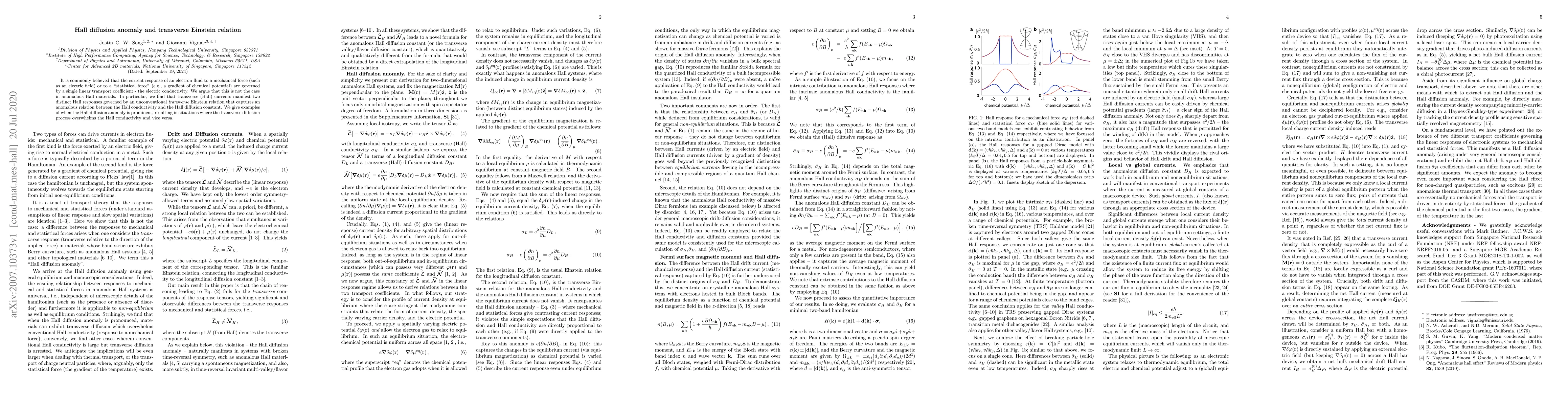 This paper argues that in anomalous Hall materials, transverse currents exhibit two distinct Hall responses, governed by an unconventional transverse Einstein relation, which reveals an anomalous relationship between Hall conductivity and Hall diffusion constant. It highlights scenarios where transverse diffusion dominates over Hall conductivity and vice versa.