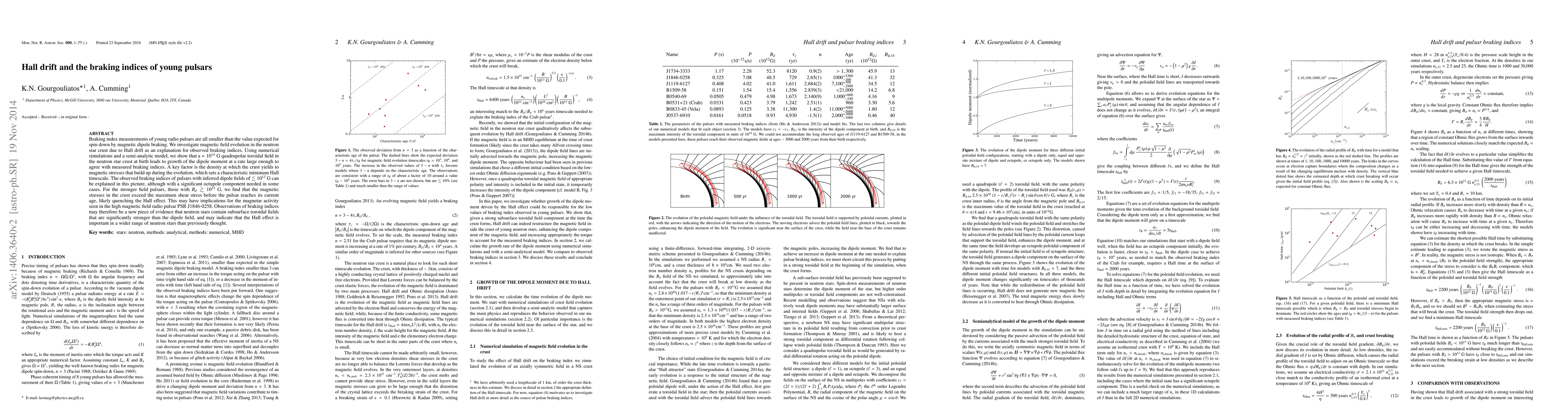 This paper explores the braking indices of young pulsars, suggesting that Hall drift in the neutron star crust can explain observed values lower than those expected from magnetic dipole braking. Numerical simulations and models indicate that a quadrupolar toroidal field of $\approx 10^{14}\ {\rm G}$ at birth can lead to sufficient dipole moment growth, with implications for pulsars with dipole fields up to $10^{13}\ {\rm G}$.