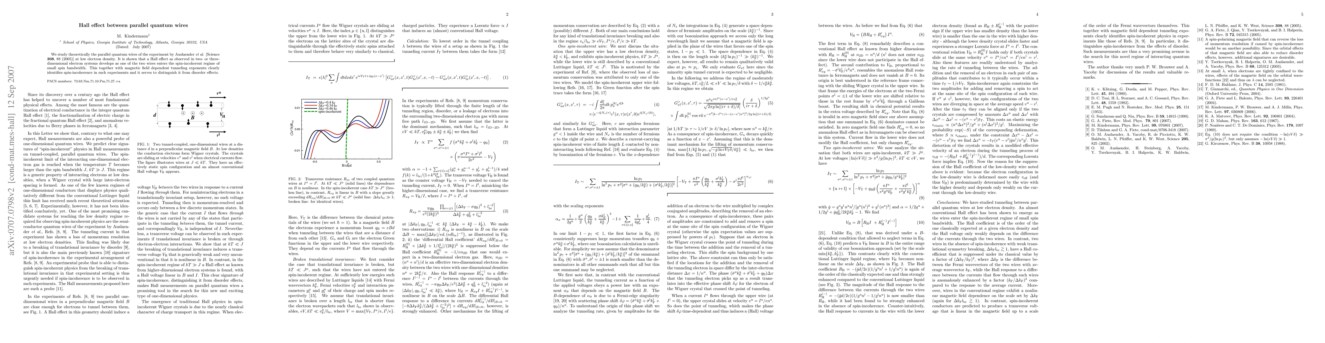 This paper theoretically investigates parallel quantum wires at low electron density, revealing a Hall effect that emerges when one wire enters the spin-incoherent regime, thus distinguishing spin-incoherence from disorder effects. The study supports the findings of Auslaender et al. [Science 308, 88 (2005)].