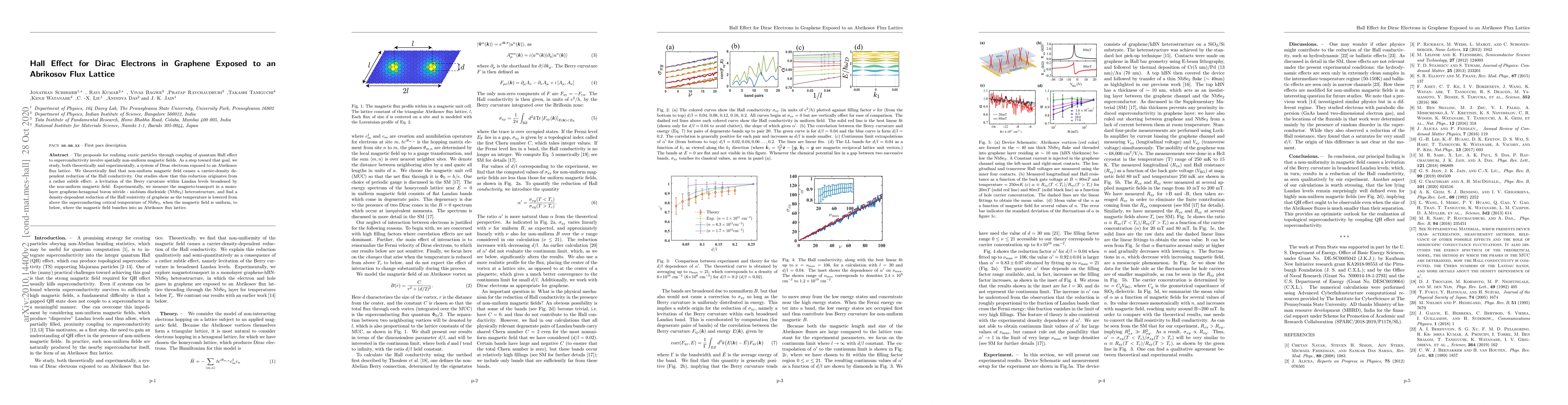 The proposals for realizing exotic particles through coupling of quantum Hall effect to superconductivity involve spatially non-uniform magnetic fields. As a step toward that goal, we study, both theoretically and experimentally, a system of Dirac electrons exposed to an Abrikosov flux lattice. We theoretically find that non-uniform magnetic field causes a carrier-density dependent reduction of the Hall conductivity. Our studies show that this reduction originates from a rather subtle effect: a levitation of the Berry curvature within Landau levels broadened by the non-uniform magnetic field. Experimentally, we measure the magneto-transport in a monolayer graphene-hexagonal boron nitride - niobium diselenide (NbSe$_2$) heterostructure, and find a density-dependent reduction of the Hall resistivity of graphene as the temperature is lowered from above the superconducting critical temperature of NbSe$_2$, when the magnetic field is uniform, to below, where the magnetic field bunches into an Abrikosov flux lattice.