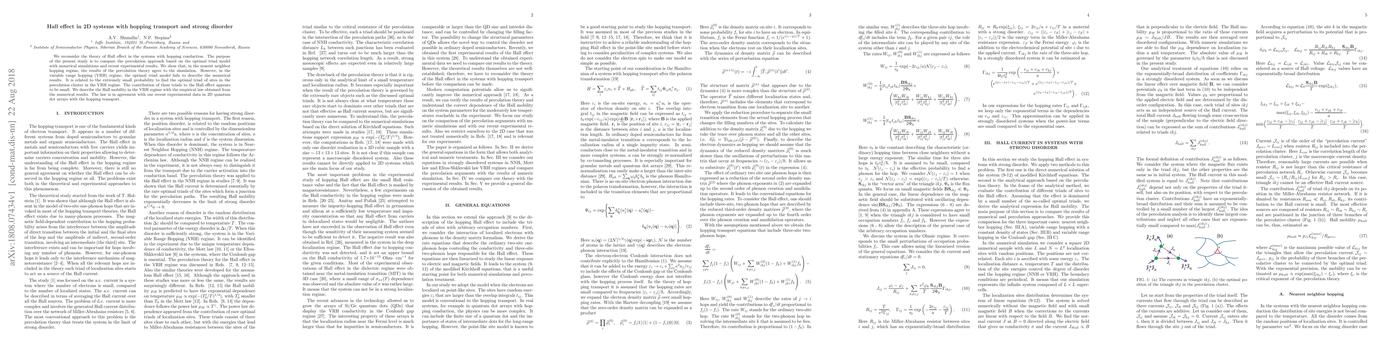 We reconsider the theory of Hall effect in the systems with hopping conduction. The purpose of the present study is to compare the percolation approach based on the optimal triad model with numerical simulations and recent experimental results. We show that, in the nearest neighbor hopping regime, the results of the percolation theory agree to the simulation. However, in the variable range hopping (VRH) regime, the optimal triad model fails to describe the numerical results. It is related to the extremely small probability to find the optimal triad of sites in the percolation cluster in the VRH regime. The contribution of these triads to the Hall effect appears to be small. We describe the Hall mobility in the VRH regime with the empirical law obtained from the numerical results. The law is in agreement with our recent experimental data in 2D quantum dot arrays with the hopping transport.