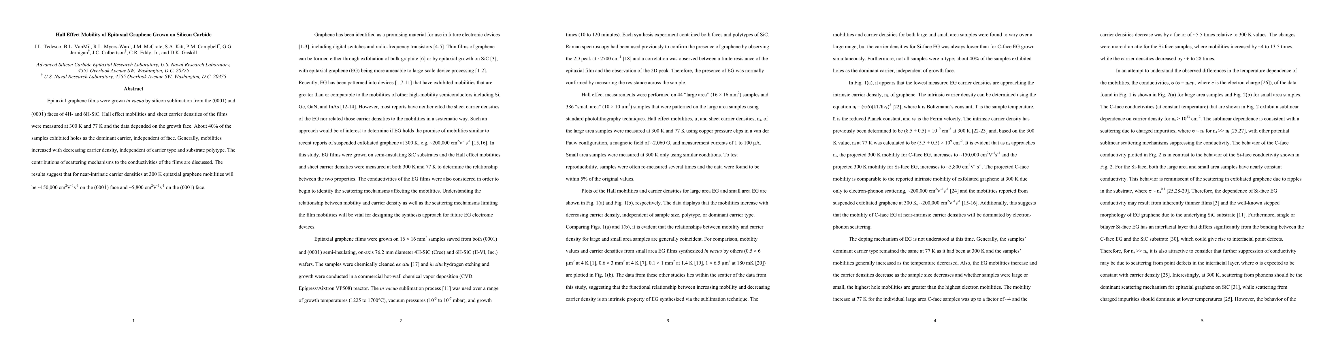 Epitaxial graphene grown on silicon carbide exhibits varying Hall effect mobilities of ~150,000 cm2V-1s-1 on the (000-1) face and ~5,800 cm2V-1s-1 on the (0001) face, with carrier density affecting mobility independently of substrate polytype.