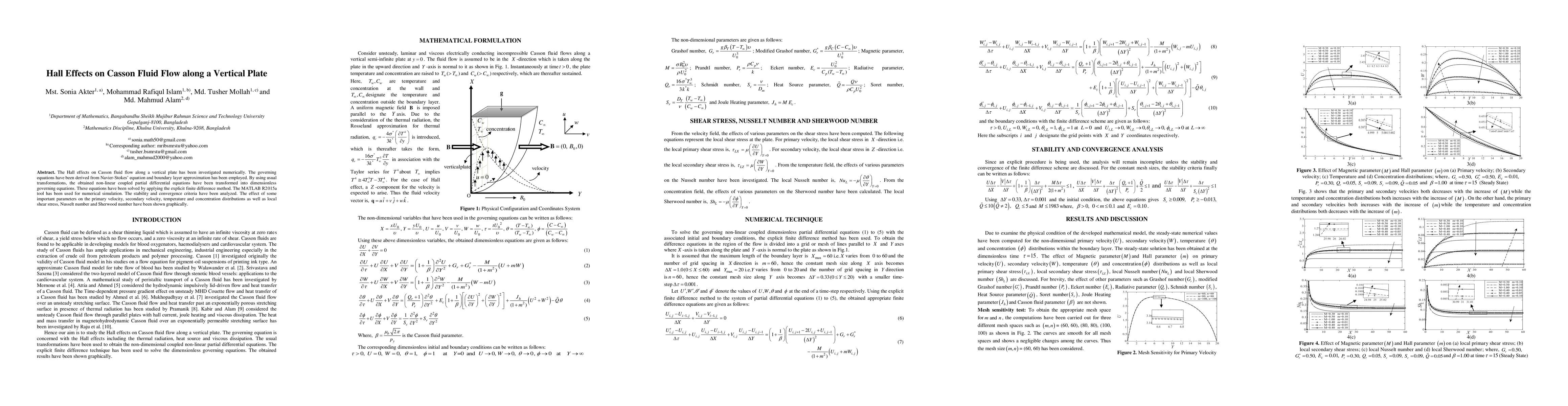 The Hall effects on Casson fluid flow along a vertical plate has been investigated numerically. The governing equations have been derived from Navier-Stokes' equation and boundary layer approximation has been employed. By using usual transformations, the obtained non-linear coupled partial differential equations have been transformed into dimensionless governing equations. These equations have been solved by applying the explicit finite difference method. The MATLAB R2015a tool has been used for numerical simulation. The stability and convergence criteria have been analyzed. The effect of some important parameters on the primary velocity, secondary velocity, temperature and concentration distributions as well as local shear stress, Nusselt number and Sherwood number have been shown graphically.