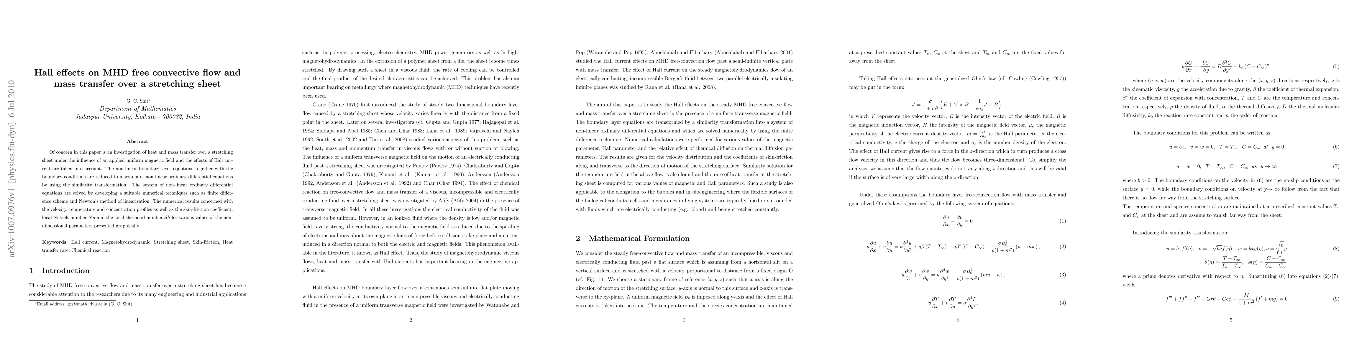 This paper investigates the heat and mass transfer over a stretching sheet under the influence of a magnetic field, considering Hall current effects. Numerical techniques are employed to solve the resulting non-linear ordinary differential equations, with results presented graphically for velocity, temperature, concentration profiles, and various transfer coefficients.