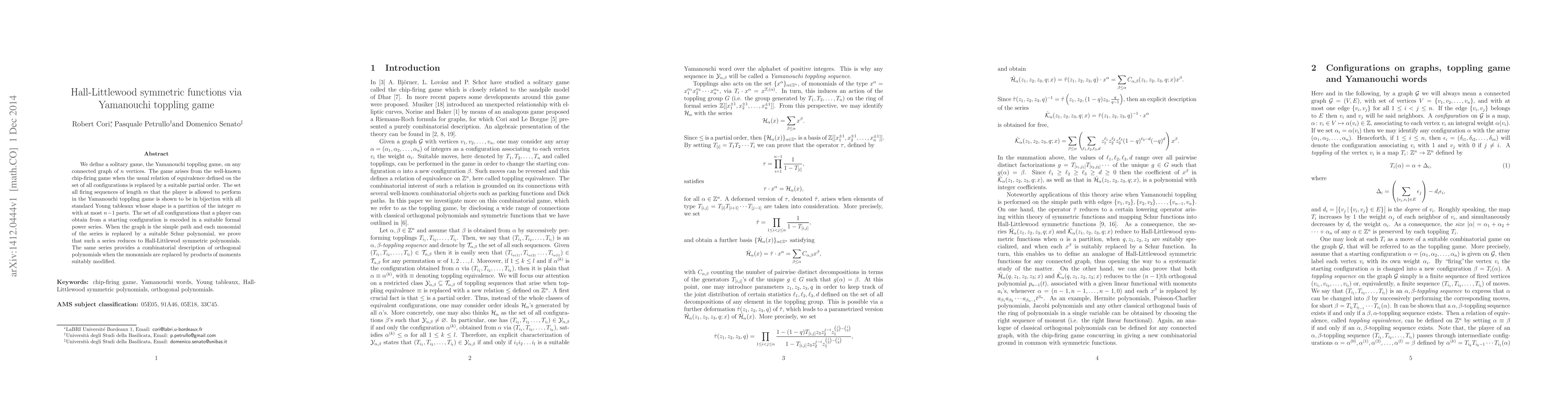 We define a solitary game, the Yamanouchi toppling game, on any connected graph of n vertices. The game arises from the well-known chip-firing game when the usual relation of equivalence defined on the set of all configurations is replaced by a suitable partial order. The set all firing sequences of length m that the player is allowed to perform in the Yamanouchi toppling game is shown to be in bijection with all standard Young tableaux whose shape is a partition of the integer m with at most n-1 parts. The set of all configurations that a player can obtain from a starting configuration is encoded in a suitable formal power series. When the graph is the simple path and each monomial of the series is replaced by a suitable Schur polynomial, we prove that such a series reduces to Hall-Littlewod symmetric polynomials. The same series provides a combinatorial description of orthogonal polynomials when the monomials are replaced by products of moments suitably modified.