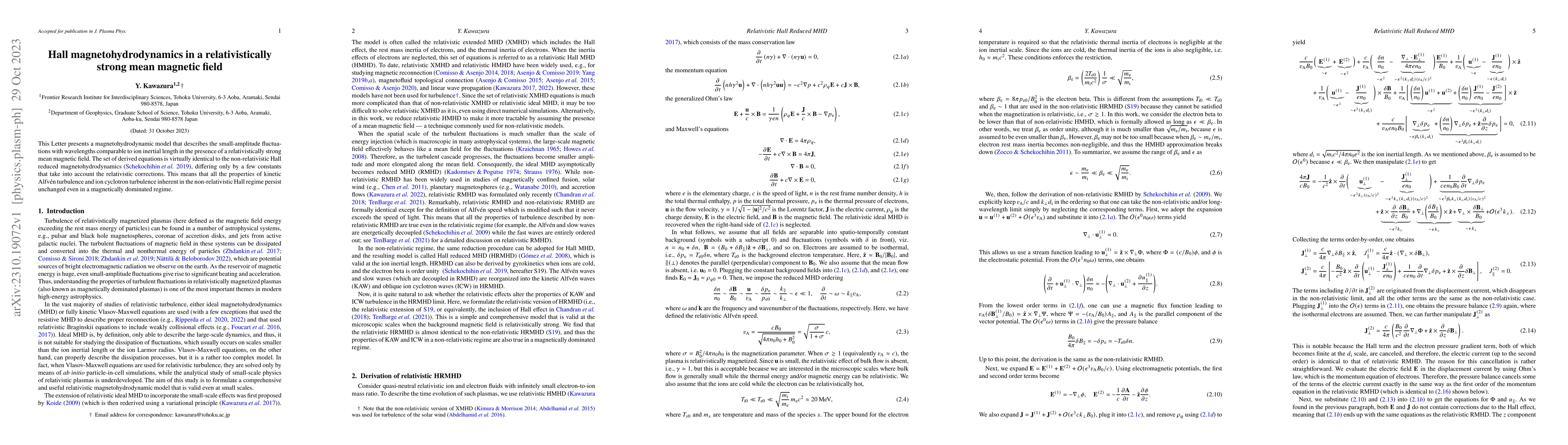 This paper develops a magnetohydrodynamic model for small-amplitude fluctuations in relativistically strong magnetic fields, showing that the properties of non-relativistic Hall magnetohydrodynamics remain valid with minor relativistic corrections. The model retains kinetic Alfv\'en and ion cyclotron turbulence characteristics.